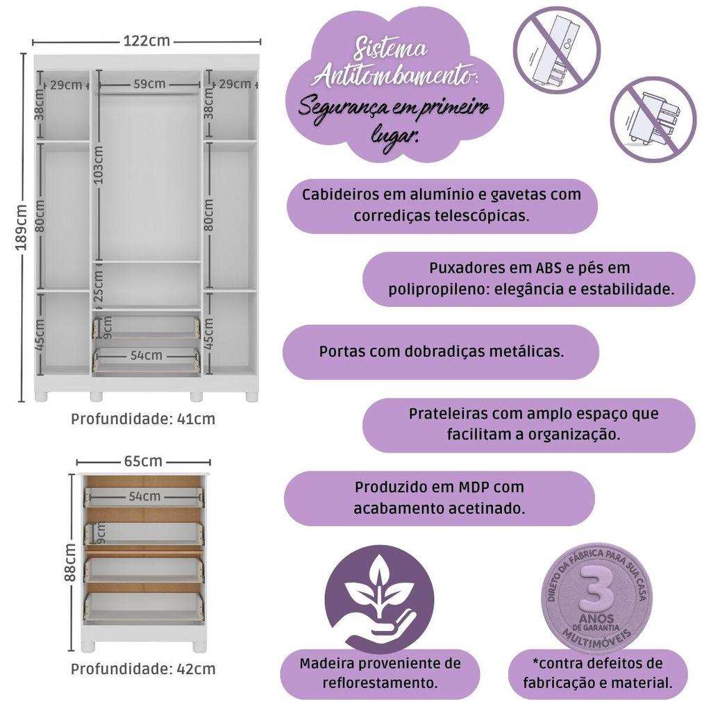 O quarto do seu bebê é o cenário dos sonhos que estão prestes a começar. Com o Quarto de Bebê Completo com Berço Americano 3 em 1 Colchão Incluso Multimóveis MP4602, você cria um ambiente repleto de doçura, praticidade e amor — perfeito para acompanhar cada nova descoberta do seu pequeno. Diferenciais: - 3 anos de garantia contra defeitos de fabricação e material (exceto colchão). - Conjunto produzido em madeira de reflorestamento (MDP 12/15mm) com acabamento acetinado (cerca de 20% de brilho): sustentabilidade e durabilidade. - Berço 3 em 1 que se transforma em sofá e minicama, acompanhando o crescimento do bebê. - Lastro em madeira com 3 regulagens de altura e suporte para mosquiteiro para noites mais tranquilas e protegidas. - Berço certificado pelo INMETRO (Selo nº 0000085/2018). - Padrão americano (tamanho do colchão: 130x70cm). - Colchão D18 incluso: possui tratamento antiácaro, antialérgico, antimofo e um dos lados impermeável. - Grade Soft (PVC): ecologicamente correta, com matéria-prima livre de metais pesados, atóxica e com proteção antiamarelamento. - Guarda-roupa com 4 portas e 2 gavetas: amplo espaço para organizar roupinhas e acessórios. - Cômoda com 4 gavetas. - Corrediças telescópicas: abertura total e silenciosa das gavetas. - Cabideiro em alumínio: permite acomodar roupas longas e curtas para que não amassem. - Puxadores em ABS delicados e práticos. - Pés em polipropileno e rodapés: visual elegante e estabilidade para o guarda-roupa e a cômoda. - Sistema antitombamento no guarda-roupa e cômoda: proporciona segurança para o bebê e tranquilidade aos pais. Conteúdo da Embalagem: 1 (um) Berço 1 (um) Colchão 1 (um) Guarda-roupa 1 (uma) Cômoda Manual de Montagem Kit Ferragem Dimensões do Produto Montado: Berço - Altura: 80,5cm | Largura: 133cm | Profundidade: 77,5cm Colchão - Altura: 10cm | Largura: 130cm | Profundidade: 70cm Guarda-roupa - Altura: 189cm | Largura: 122cm | Profundidade: 41cm Cômoda - Altura: 88cm | Largura: 65cm | Profundidade: 42cm *Você pode consultar as medidas detalhadas na imagem técnica do produto. Observações Importantes: *As cores dos produtos podem sofrer variações de tonalidade de acordo com as configurações do seu dispositivo. *Aqui na Loja Multimóveis, você pode concluir sua compra facilmente com toda segurança. A entrega é garantida e você está em 1° lugar. *Imagens meramente ilustrativas (decoração não inclusa). *Os produtos serão entregues desmontados e não disponibilizamos o serviço de montagem.