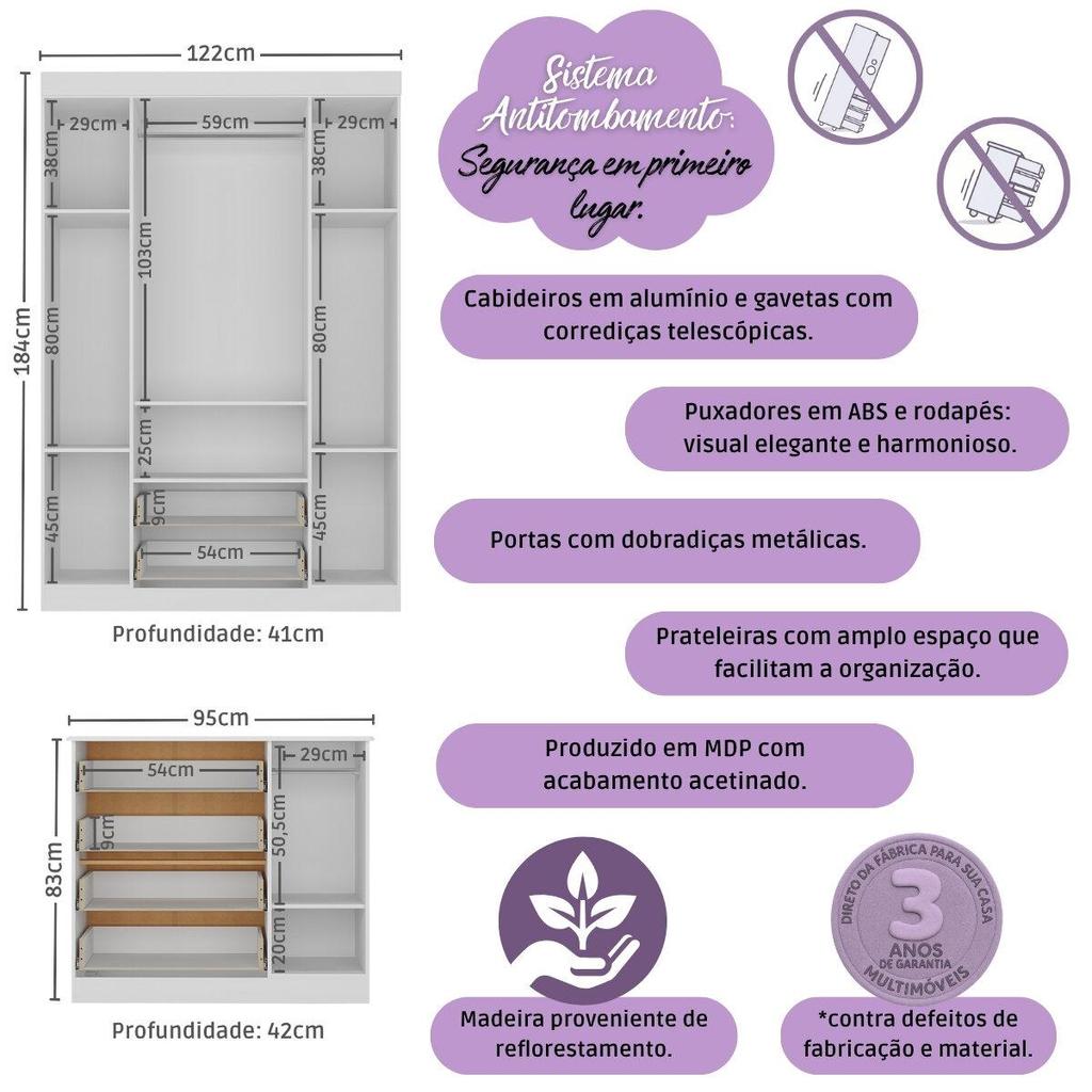 Cada detalhe do Quarto de Bebê Completo com Berço Americano 3 em 1 Colchão Incluso Multimóveis MP4597 foi pensado para acolher o seu pequeno com amor, conforto e segurança. Um espaço encantador que transmite tranquilidade e transforma os primeiros momentos do bebê em lembranças cheias de ternura. Diferenciais: - 3 anos de garantia contra defeitos de fabricação e material (exceto colchão). - Conjunto produzido em madeira de reflorestamento (MDP 12/15mm) com acabamento acetinado (cerca de 20% de brilho): sustentabilidade e durabilidade. - Berço 3 em 1 que se transforma em sofá e minicama, acompanhando o crescimento do bebê. - Lastro em madeira com 3 regulagens de altura e suporte para mosquiteiro para noites mais tranquilas e protegidas. - Grade Soft (PVC): ecologicamente correta, com matéria-prima livre de metais pesados, atóxica e com proteção antiamarelamento. - Berço certificado pelo INMETRO (Selo nº 0000085/2018). - Padrão americano (tamanho do colchão: 130x70cm). - Colchão D18 incluso: possui tratamento antiácaro, antialérgico, antimofo e um dos lados impermeável. - Guarda-roupa com 4 portas e 2 gavetas: amplo espaço para organizar roupinhas e acessórios. - Cômoda com 1 porta e 4 gavetas. - Corrediças telescópicas: abertura total e silenciosa das gavetas. - Cabideiro em alumínio: permite acomodar roupas longas e curtas para que não amassem. - Puxadores em ABS delicados e práticos. - Rodapés: visual elegante para o guarda-roupa e a cômoda. - Sistema antitombamento no guarda-roupa e cômoda: proporciona segurança para o bebê e tranquilidade aos pais. Conteúdo da Embalagem: 1 (um) Berço 1 (um) Colchão 1 (um) Guarda-roupa 1 (uma) Cômoda Manual de Montagem Kit Ferragem Dimensões do Produto Montado: Berço - Altura: 80,5cm | Largura: 133cm | Profundidade: 77,5cm Colchão - Altura: 10cm | Largura: 130cm | Profundidade: 70cm Guarda-roupa - Altura: 184cm | Largura: 122cm | Profundidade: 41cm Cômoda - Altura: 83cm | Largura: 95cm | Profundidade: 42cm *Você pode consultar as medidas detalhadas na imagem técnica do produto. Observações Importantes: *As cores dos produtos podem sofrer variações de tonalidade de acordo com as configurações do seu dispositivo. *Aqui na Loja Multimóveis, você pode concluir sua compra facilmente com toda segurança. A entrega é garantida e você está em 1° lugar. *Imagens meramente ilustrativas (decoração não inclusa). *Os produtos serão entregues desmontados e não disponibilizamos o serviço de montagem.