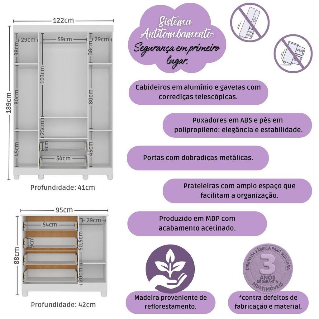 Cada detalhe do Quarto de Bebê Completo com Berço Americano 3 em 1 p/Colchão 130x70cm Multimóveis MP4582 foi pensado para acolher o seu pequeno com amor, conforto e segurança. Um espaço encantador que transmite tranquilidade e transforma os primeiros momentos do bebê em lembranças cheias de ternura. Diferenciais: - 3 anos de garantia contra defeitos de fabricação e material. - Conjunto produzido em madeira de reflorestamento (MDP 12/15mm) com acabamento acetinado (cerca de 20% de brilho): sustentabilidade e durabilidade. - Berço 3 em 1 que se transforma em sofá e minicama, acompanhando o crescimento do bebê. - Lastro em madeira com 3 regulagens de altura e suporte para mosquiteiro para noites mais tranquilas e protegidas. - Berço certificado pelo INMETRO (Selo nº 0000085/2018). - Padrão americano (tamanho do colchão indicado: 130x70cm). Colchão não incluso. - Grade Soft (PVC): ecologicamente correta, com matéria-prima livre de metais pesados, atóxica e com proteção antiamarelamento. - Guarda-roupa com 4 portas e 2 gavetas: amplo espaço para organizar roupinhas e acessórios. - Cômoda com 1 porta e 4 gavetas. - Corrediças telescópicas: abertura total e silenciosa das gavetas. - Cabideiro em alumínio: permite acomodar roupas longas e curtas para que não amassem. - Puxadores em ABS delicados e práticos. - Pés em polipropileno e rodapés: visual elegante e estabilidade para o guarda-roupa e a cômoda. - Sistema antitombamento no guarda-roupa e cômoda: proporciona segurança para o bebê e tranquilidade aos pais. Conteúdo da Embalagem: 1 (um) Berço 1 (um) Guarda-roupa 1 (uma) Cômoda Manual de Montagem Kit Ferragem Dimensões do Produto Montado: Berço - Altura: 80,5cm | Largura: 133cm | Profundidade: 77,5cm Guarda-roupa - Altura: 189cm | Largura: 122cm | Profundidade: 41cm Cômoda - Altura: 88cm | Largura: 95cm | Profundidade: 42cm *Você pode consultar as medidas detalhadas na imagem técnica do produto. Observações Importantes: *As cores dos produtos podem sofrer variações de tonalidade de acordo com as configurações do seu dispositivo. *Aqui na Loja Multimóveis, você pode concluir sua compra facilmente com toda segurança. A entrega é garantida e você está em 1° lugar. *Imagens meramente ilustrativas (decoração não inclusa). *Os produtos serão entregues desmontados e não disponibilizamos o serviço de montagem.