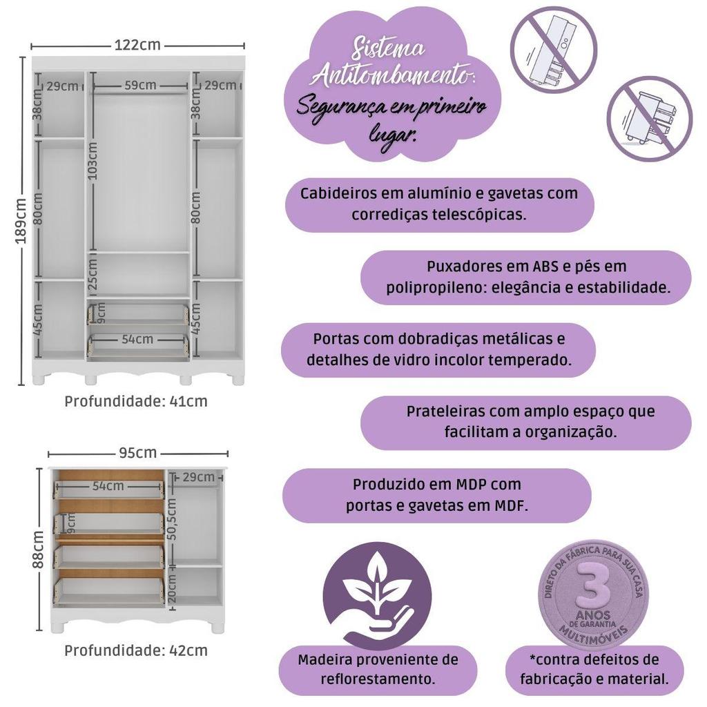 Cada detalhe do Quarto de Bebê Completo com Berço Americano 3 em 1 p/Colchão 130x70cm Multimóveis MP4647 foi criado para acolher o bebê com carinho. O design delicado e o visual encantador tornam o ambiente um verdadeiro abraço — ideal para viver os momentos mais doces da infância. Diferenciais: - 3 anos de garantia contra defeitos de fabricação e material. - Conjunto produzido em madeira de reflorestamento (MDP 12/15mm) com acabamento acetinado (cerca de 20% de brilho): sustentabilidade e durabilidade. - Berço 3 em 1 que se transforma em sofá e minicama, acompanhando o crescimento do bebê. - Lastro em madeira com 3 regulagens de altura e suporte para mosquiteiro para noites mais tranquilas e protegidas. - Berço certificado pelo INMETRO (Selo nº 0000085/2018). - Padrão americano (tamanho do colchão indicado: 130x70cm). Colchão não incluso. - Grade Soft (PVC): ecologicamente correta, com matéria-prima livre de metais pesados, atóxica e com proteção antiamarelamento. - Guarda-roupa com 4 portas e 2 gavetas: amplo espaço para organizar roupinhas e acessórios. - Cômoda com 1 porta e 4 gavetas. - Portas e gavetas produzidas em MDF. - Detalhes de vidro incolor temperado 3mm nas portas: toque charmoso que permite visualizar o interior dos móveis. - Corrediças telescópicas: abertura total e silenciosa das gavetas. - Cabideiro em alumínio: permite acomodar roupas longas e curtas para que não amassem. - Puxadores em ABS delicados e práticos. - Pés em polipropileno e rodapés usinados em MDF: visual elegante e estabilidade para o guarda-roupa e a cômoda. - Sistema antitombamento no guarda-roupa e cômoda: proporciona segurança para o bebê e tranquilidade aos pais. Conteúdo da Embalagem: 1 (um) Berço 1 (um) Guarda-roupa 1 (uma) Cômoda Manual de Montagem Kit Ferragem Dimensões do Produto Montado: Berço - Altura: 80,5cm | Largura: 133cm | Profundidade: 77,5cm Guarda-roupa - Altura: 189cm | Largura: 122cm | Profundidade: 41cm Cômoda - Altura: 88cm | Largura: 95cm | Profundidade: 42cm *Você pode consultar as medidas detalhadas na imagem técnica do produto. Observações Importantes: *As cores dos produtos podem sofrer variações de tonalidade de acordo com as configurações do seu dispositivo. *Aqui na Loja Multimóveis, você pode concluir sua compra facilmente com toda segurança. A entrega é garantida e você está em 1° lugar. *Imagens meramente ilustrativas (decoração não inclusa). *Os produtos serão entregues desmontados e não disponibilizamos o serviço de montagem.