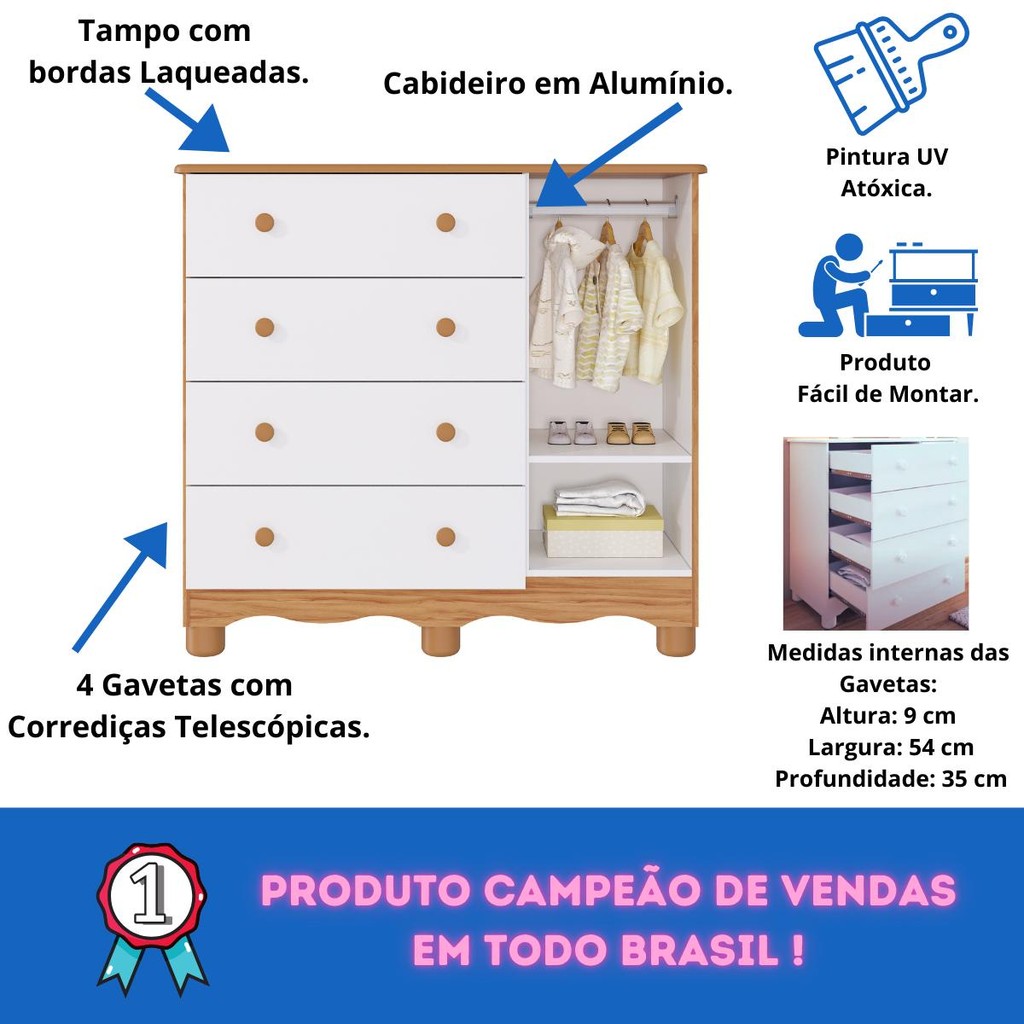 Quarto de Bebe Completo com Guarda Roupa 3 Portas 1 Cômoda Bolinha 4 Gavetas Faura são móveis que se complementam, facilitando muito a vida de quem está montando um quarto do bebe, buscando melhor organização e decoração para o ambiente. O quarto de bebe completo Peroba é composto pelo Armário Bolinha 03 portas com a Cômoda Bolinha. Produtos 100% MDF, pintura é atóxica, possuem cabideiro metálico, puxadores ABS, corrediças telescópicas e portas tem acabamento com PETG cristal. FICHA TÉCNICA -Cômoda Infantil Bolinha Altura: 88 cm Largura: 95,3 cm Profundidade: 42 cm Quantidade de Gavetas: 04 Gavetas ( Peso suportado 4Kg) Quantidade de Portas: 01 Porta Material: 100% MDF Acabamento do Produto: Pintura UV Atóxica/ Pintura PU e Fita de Bordo Acabamento das Portas: PETG Cristal ( Acrílico transparente ) Tipo de Corrediça: Telescópica Tipo de Cabideiro: Metálico Tipo de Puxadores: ABS Tipo de Pés: ABS( Altura 6cm) -Guarda Roupa Infantil Bolinha Altura: 188 cm Largura: 92,0 cm Profundidade: 41 cm Quantidade de Gavetas: 03 Gavetas ( Peso suportado 4Kg) Quantidade de Portas: 03 Portas Material: 100% MDF Acabamento do Produto: Pintura UV Atóxica/ Pintura PU e Fita de Bordo Acabamento das Portas: PETG Cristal ( Acrílico transparente ) Tipo de Corrediça: Telescópica Tipo de Cabideiro: Metálico Tipo de Puxadores: ABS Tipo de Pés: ABS( Altura 6cm) Embalagem: Peças envoltas em isomanta, caixa de papelão revestidas com plástico termoencolhível Manual de Montagem: Manual segue na embalagem do produto Recomendações de Uso, Manutenção e Limpeza: Para limpeza utilize somente pano limpo e macio, ligeiramente umedecido em água (apenas o bastante para remover a poeira), seguido de um pano seco. Perguntas Frequentes: A - É fácil montar Guarda Roupa Infantil e Cômoda Infantil Bolinha da Faura? Sim, é fácil. Ao abrir a embalagem pode parecer complicado, mas é só seguir o passo a passo no manual de montagem que você consegue! B - Qual Berço combina com o Guarda Roupa Infantil e Cômoda Infantil Bolinha da Faura? Para ter mais beleza, estilo e praticidade no quarto do seu bebê, sugerimos completar sua coleção com o Berço Bolinha. É só pesquisar aqui no site que você vai encontrar. C - Tenho a opção de comprar Guarda Roupa Infantil ou Cômoda Infantil Bolinha separado? Sim, só buscar aqui no site que vai encontrar nossa oferta. D - Qual a configuração do Guarda Roupa Infantil e Cômoda Infantil Bolinha da Faura? É uma Cômoda infantil Bolinha com 4 gavetas e 1 porta. Guarda Roupa Infantil Bolinha com 3 gavetas e 3 portas. E - Onde comprar o Guarda Roupa Infantil e Cômoda infantil Bolinha com segurança? Aqui é o site com o melhor preço e condições de entrega para você comprar.