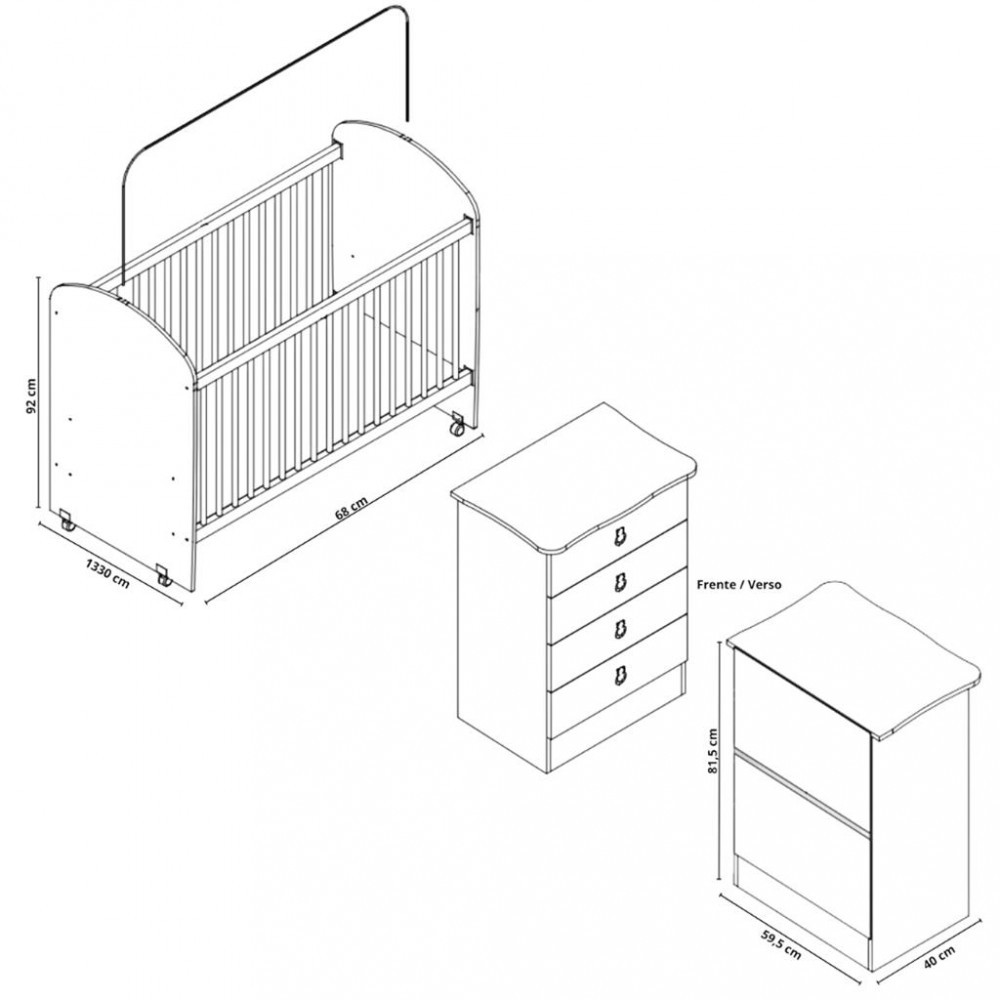 O Berço infantil da Móveis Percasa foi cuidadosamente projetado para garantir o conforto e a segurança do bebê. Estrutura em chapa de MDP de 15 mm, possui bordas de PVC arredondadas e estrado de chapa inteira para maior proteção do bebê. Certificado pelo Inmetro 003922/2018, o berço conta com acabamento em semi-brilho e grades de madeira revestidas com plástico. Acompanha suporte para mosquiteiro e kit de rodízios para facilitar a movimentação. A Cômoda infantil em MDP de 15 mm também se destaca pelo design encantador e pela funcionalidade, ideal para organizar roupas e acessórios com segurança. Características Berço: 2 rodízios com trava 2 rodízios sem trava Acompanha Suporte para Mosquiteiro Borda em PVC Certificado pelo Inmetro 003922/2018 Estrado é de chapa inteira Estrutura em MDP 15 mm Grades em madeira, revestidas de plástico Medida colchão indicada 130 cm x 60 cm 2 Opções de Altura do Estrado Tipo de grade Fixa Características Cômoda: 4 Gavetas 4 Puxadores em formato de urso Acabamento semi-brilho Corrediças telescópicas Estrutura em chapa de MDP de 15 mm Estrutura puxadores em Plástico Não possui pés Peso suportado nas gavetas 2 kg Dimensões Berço: Altura: 92 cm Largura: 68 cm Profundidade: 1330 cm Peso: 20,60 kg Dimensões Cômoda: Altura: 81,5 cm Largura: 59,5 cm Profundidade: 40 cm Peso: 20,90 kg Garantia do fornecedor de 3 meses. *Imagens meramente ilustrativas, tonalidades podem sofrer alterações. Objetos decorativos das imagens não acompanham o produto.