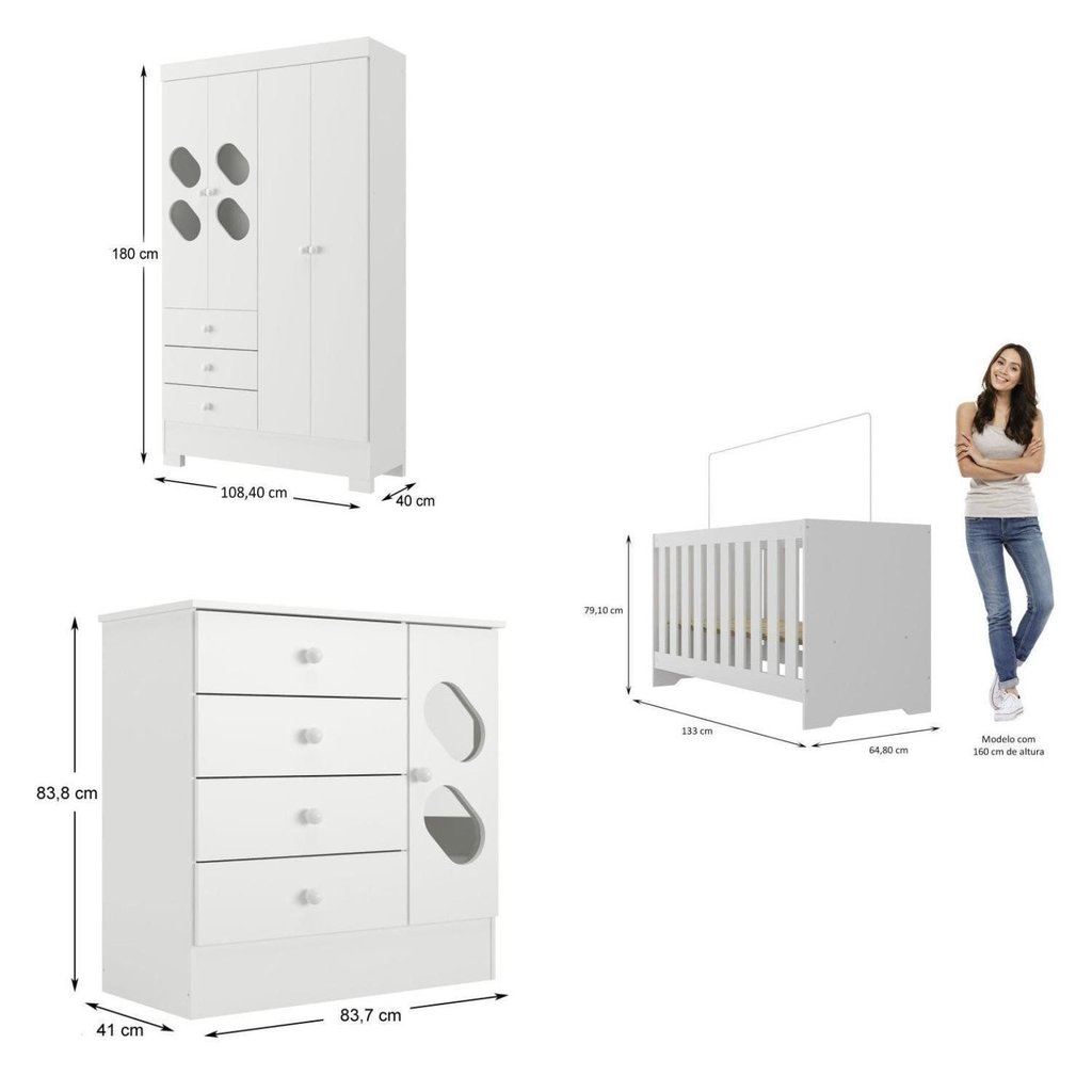 O Quarto de Bebê Hera é uma escolha encantadora e funcional para o quarto do seu recém-nascido. Composto por um guarda-roupa, uma cômoda e um berço, este conjunto oferece resistência, estilo e funcionalidade. Cada peça é cuidadosamente construída com atenção aos detalhes, incluindo corrediças suaves, puxadores elegantes e uma estética moderna. As instruções detalhadas no manual de montagem tornam a montagem simples, e a embalagem segura protege as peças durante o transporte. O berço é versátil, podendo ser montado como berço, mini-cama e sofá. O "Quarto de Bebê Hera" cria um ambiente acolhedor para o seu bebê, combinando charme e praticidade. Peso (kg): 111.88 Garantia: 03 Meses Possui Portas: Sim Porta Janelada: Não Possui Gavetas: Sim Possui Rodízio: Não Suporta Até (kg): 20 Possui Espelhos: Não Escala de Brilho: Fosco Material da Porta: MDP Material do Fundo: MDF Origem do Produto: Nacional Ambiente Principal: Quarto de Bebê Material da Gaveta: MDP Material Principal: MDP Possui Certificado: Sim Possui Prateleiras: Sim Largura do Conjunto: 256.9 Material do Estrado: Madeira Quantidade de Itens: 3 Material da Prateleira: MDP Profundidade do Conjunto: 94.3 Tipo de Corrediça da Gaveta: Metálica Simples Acompanha Manual de Instalação: Sim Medida de Cada Item (A x L x P) (novo): Guarda Roupa: 180cm x 108,4cm x 40cm Cômoda: 83,8cm x 83,7cm x 41cm Berço:79,1cm x 64,8cm x 13,3cm Tipo de Dobradiça/Corrediça da Porta: Metálica Estrado Regulável em Quantas Posições: 3 Marca: Espresso Móveis Cor Interna: Branco Cor do Produto: Branco Itens Inclusos: Guarda Roupa,Cômoda,Berço, Kit Ferragens e Manual de Montagem Cor Predominante: Branco Linha ou Coleção: Espresso Móveis Peso de Cada Item: Guarda Roupa: 58,90 Cômoda: 29,90 Berço:23,08 Tipo de Certificado: INMETRO 000771/2022 Quantidade de Prateleiras: 03 Prateleiras Certificado INMETRO (código): INMETRO 000771/2022 Quantidade de Gavetas: 07 Gavetas