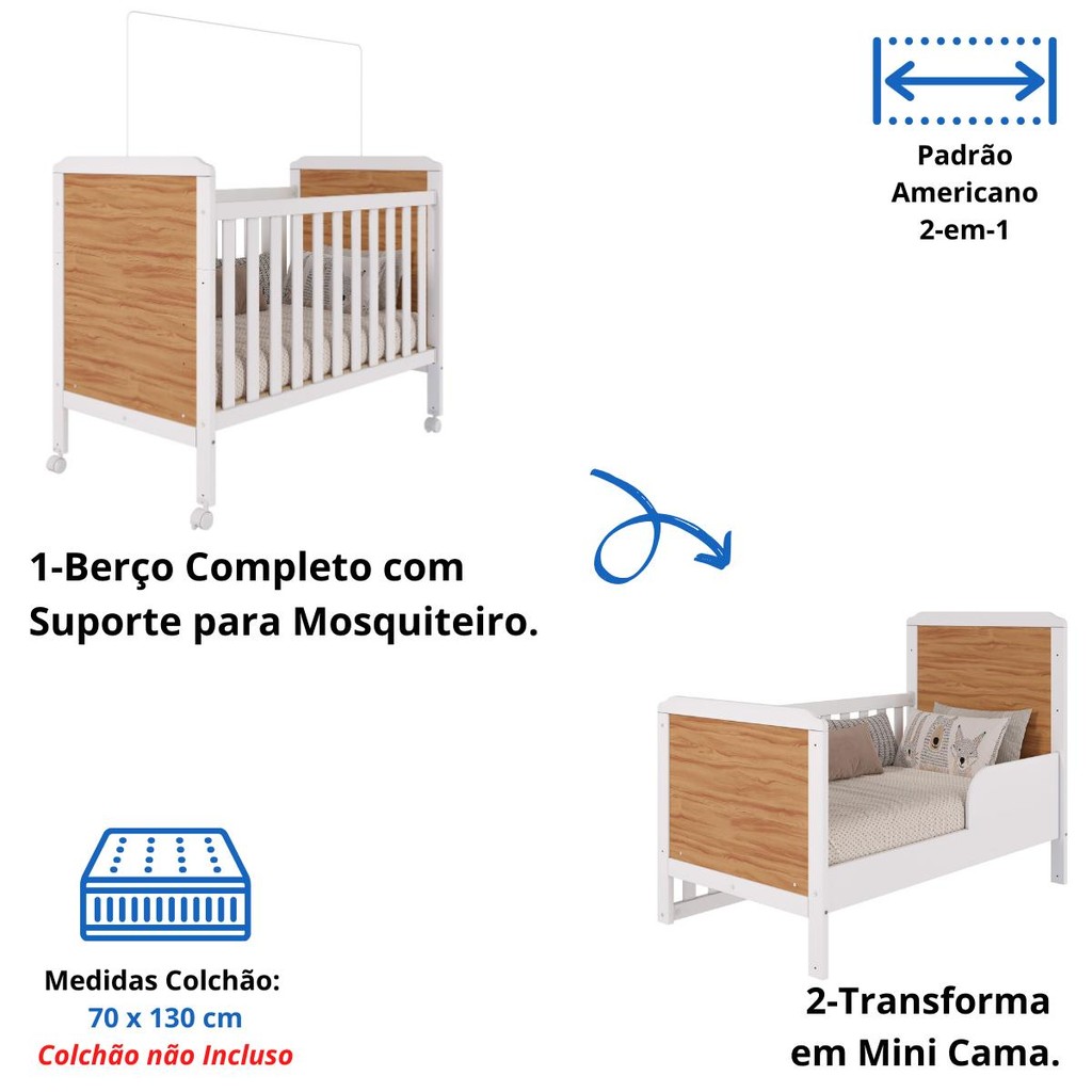 O Quarto de Bebê Completo da Faura, composto pelo Guarda-Roupa Uli, Cômoda Uli e o Berço Mini Cama Cloe, é ideal para quem busca praticidade, segurança e charme na decoração do quarto infantil. O conjunto é feito 100% em MDF, com pintura atóxica, oferecendo durabilidade e segurança para o bebê. O berço, que segue o padrão americano, é versátil e pode ser transformado em mini cama, além de contar com varal para mosquiteiro, regulagem de altura do colchão, bordas arredondadas e rodízios com travas. A cômoda e o guarda-roupa oferecem ótimo espaço para organização, com gavetas amplas, porta com prateleiras, cabideiro metálico, puxadores em ABS e corrediças telescópicas. Os pés também são em ABS, e os produtos vêm com dois modelos de rodapé para escolher: reto ou ondulado. Além disso, o acabamento das portas com PETG cristal garante um visual sofisticado e moderno. Todos os berços da Faura são certificados pelo INMETRO, assegurando ainda mais confiança aos pais. Informações Técnicas: -Material: 100% MDF -Cores Disponíveis: Branco Brilho, Amêndoa/Branco -Acabamento do Produto: Pintura UV Atóxica/ Pintura PU e Fita de Bordo -Acabamento das Portas: PETG Cristal(Acrílico transparente) -Tipo de Corrediça: Telescópica -Tipo de Cabideiro: Metálico -Tipo de Puxadores: ABS -Tipo de Pés: ABS(Altura 6cm) -Rodapé: 1 Reto e 1 Ondulado (Cliente escolhe na montagem) -Berço Cloe -Dimensões do berço montado: Altura 111,5 cm x Largura 135 cm x Profundidade: 78,2 cm -Dimensões para o colchão: Comprimento: 130 cm x Altura 12 cm (Máximo permitido) x Largura 70 cm(Colchão não Incluso) -Cômoda Infantil Uli -Altura: 88 cm -Largura: 95cm -Profundidade: 42 cm -Quantidade de Gavetas: 04 Gavetas (Peso suportado 4Kg) -Quantidade de Portas: 01 Porta -Guarda Roupa Infantil Uli -Altura: 188,5 cm -Largura: 121,1 cm -Profundidade: 41 cm -Quantidade de Gavetas: 03 Gavetas (Peso suportado 4Kg) -Quantidade de Portas: 04 Portas - Imagens meramente ilustrativas: os eletros e a decoração não acompanham o produto - Manual de Montagem: Manual segue na embalagem do produto - Os entregadores não estão autorizados a subir escadas ou elevadores, realizando a entrega apenas na recepção ou portaria, conforme as normas trabalhistas dos transportadores. Recomendamos que os clientes considerem essa limitação ao realizar suas compras. Perguntas Frequentes: A - É fácil montar o Berço Cloe, Guarda Roupa Infantil e Cômoda Infantil Uli da Faura? R - Nível de complexidade alta, sugerimos a contratação de um montador especializado. Nós não realizamos a montagem dos produtos e não oferecemos esse serviço. B - Tenho a opção de comprar Berço Cloe, Guarda Roupa Infantil ou Cômoda Infantil Uli separado? R - Sim, só buscar aqui no site que vai encontrar nossa oferta. C - Qual a configuração do Guarda Roupa Infantil e Cômoda Infantil Uli da Faura? R - É uma Cômoda infantil Uli com 4 gavetas e 1 porta. Guarda Roupa Infantil Uli com 3 gavetas e 4 portas. D - Como organizar a Cômoda infantil Uli? R - Você vai naturalmente encontrar a melhor maneira de organizar sua cômoda. Entretanto, vale a pena pontuar algumas situações: 1-A cômoda deve estar sempre limpa*; 2-O Trocador (caso você tenha) pode ocupar bastante espaço no tampo da cômoda; 3-Primeira Gaveta: Utilize para os produtos de Higiene do bebê; 4-Demais Gavetas: Utilize para roupas e acessórios do bebê. E - Quais as cores disponíveis para o Berço Cloe, Guarda Roupa Infantil e Cômoda Infantil Uli da Faura? R - Temos nas cores Branco Brilho, Amêndoa/Branco.