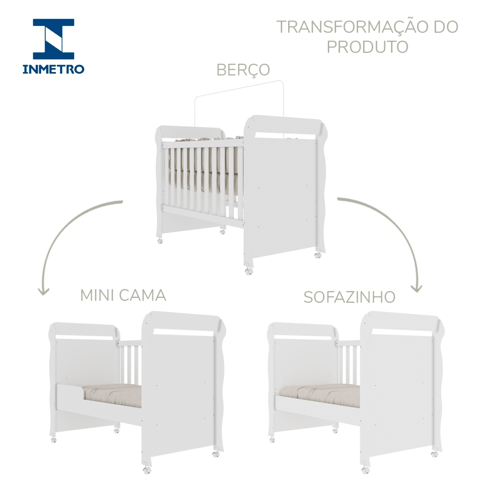 Os primeiros anos de vida sempre passam muito rápido, e saber aproveitar cada momento com o seu baby é fundamental. Não é à toa que a Carolina sempre traz soluções inteligentes que casam perfeitamente com as suas ideias. O berço 3 em 1 que também serve como mini-cama e mini-sófá, e nossa cômoda fraldário são peças de alta resistência e durabilidade. Estes produtos se encontram disponíveis na cor Branco Brilho. INFORMAÇÕES TÉCNICAS DOS PRODUTOS CÓDIGO DO FABRICANTE: 301487 MODELO: Quarto de Bebê. TIPO DE PINTURA: UV, com acabamento por camadas de verniz foto curado de composição não tóxica. ESTRUTURA DO BERÇO: MDF. REGISTRO DO INMETRO: 009413/2022 GRADES DO BERÇO: MDF. ESTRADO DO BERÇO: Em chapa de MDF de 6 mm, com fixação por parafusos, regulável para 2 posições. MEDIDAS DO BERÇO (CxLxA) cm: 154,8 x 77,9 x 114,3 MEDIDAS DO COLCHÃO (CxLxA) cm: 130 x 70 x 10 ou 12 (Colchão não incluso). SUPORTE P/ MOSQUITEIRO: Sim. KIT RODÍZIOS: Sim. SUPORTA ATÉ (KG): 60 ESTRUTURA DA CÔMODA: MDP. MEDIDAS DA CÔMODA (CxLxA) cm: 130 x 41 x 92,5 CORREDIÇA DAS GAVETAS: Gavetas abrem e fecham suavemente sobre trilhos telescópicos com trava de segurança. PUXADORES DAS GAVETAS E/OU PORTA (as): Em PVC (Plástico). MATERIAL DOS PÉS: Em PVC (Plástico), resistente à água. QUANTIDADE DE PRATELEIRA: 1 POSSUI TRAVA ANTI TOMBAMENTO: Sim. ADVERTÊNCIAS: Não nos responsabilizamos pela montagem dos produtos. A tonalidade da cor do produto pode variar entre a imagem de exibição do anúncio e o item físico. Leia atentamente todas as instruções de montagem contidas no manual de montagem do produto antes de iniciar a montagem do produto. Guarde este documento para futuras utilizações. Consequências pela não observação e seguimento das advertências aqui descritas são de inteira responsabilidade do usuário, ficando o fabricante isento de quaisquer responsabilidades por quaisquer fatos/acidentes que possam ocorrer. PRAZO DE GARANTIA EM MESES: 3