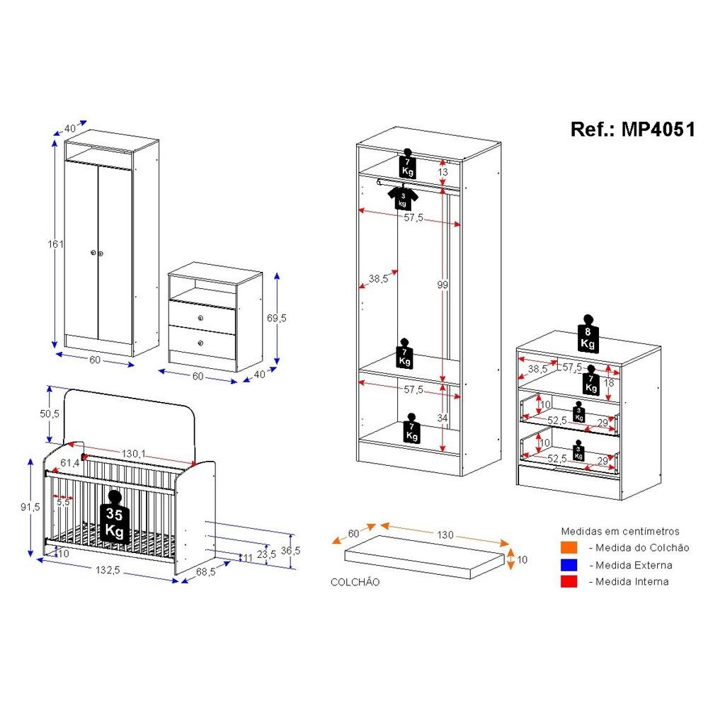 O Quarto Infantil Completo Com Colchão Incluso Doçura Multimóveis é produzido em MDP, que garante maior durabilidade e resistência, e possui acabamento acetinado (cerca de 20% de brilho). Com gavetas, cabideiro e prateleiras, o guarda-roupas e cômoda são muito funcionais para deixar o ambiente organizado. O berço possui lastro com 3 regulagens de altura e acompanha o suporte para mosquiteiro que garante noites de sono mais tranquilas. O berço é padrão nacional e certificado pelo INMETRO. O colchão, densidade D18, que acompanha o berço, possui tratamento anti-ácaro e anti-alérgico e é indicado para crianças de até 3 anos. Compacto e versátil, é uma ótima opção para ambientes compactos onde você precisa otimizar o espaço. Certificado pelo INMETRO sob o Selo n° 001073/2017 Conteúdo da Embalagem: 1 (um) Guarda-Roupas 1 (uma) Cômoda 1 (um) Berço 1 (um) Colchão Kit Ferragem Manual de Montagem Dimensões do produto montado: Guarda-Roupas - Altura: 161cm | Largura: 60cm | Profundidade: 40cm Cômoda - Altura: 69,5cm | Largura: 60cm | Profundidade: 40cm Berço - Altura: 91,5cm | Largura: 132,5cm | Profundidade: 68,5cm Colchão - Altura: 10cm | Largura: 130cm | Profundidade: 60cm *Você pode consultar as medidas detalhadas na imagem técnica do produto. *As cores do produto podem sofrer variações de tonalidade de acordo com as configurações do seu dispositivo. Imagem meramente ilustrativa. Decoração não acompanha o produto. O produto será entregue desmontado e não disponibilizamos o serviço de montagem.