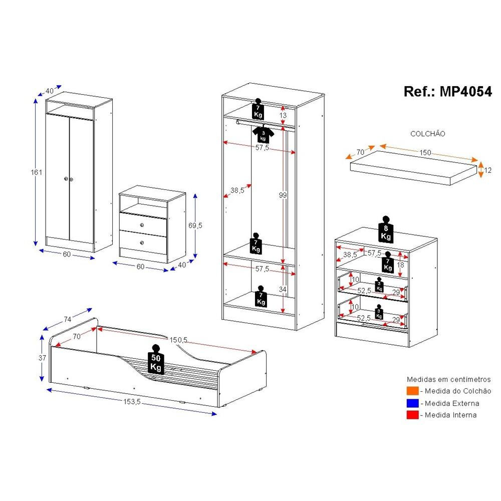O Quarto Infantil Completo Com Colchão Incluso Liz Multimóveis é produzido em MDP, que garante maior durabilidade e resistência, e possui acabamento acetinado (cerca de 20% de brilho). Com gavetas, cabideiro e prateleiras, o guarda-roupas e cômoda são muito funcionais para deixar o ambiente organizado. A minicama é produzida 100% em MDF com acabamento em pintura UV acetinada com tinta atóxica, o que garante uma maior durabilidade do produto. Com barras de proteção laterais (com recuo) que ajudam a evitar quedas e também que a criança se machuque ao descer da cama, garantindo mais segurança, a cama suporta até 50kg. O colchão (1,50 x 0,70) densidade D20, que acompanha a minicama, possui tratamento anti-ácaro e anti-alérgico. Compacto e versátil, é uma ótima opção para ambientes compactos onde você precisa otimizar o espaço. Conteúdo da Embalagem: 1 (um) Guarda-Roupas 1 (uma) Cômoda 1 (uma) Minicama 1 (um) Colchão Kit Ferragem Manual de Montagem Dimensões do produto montado: Guarda-Roupas - Altura: 161cm | Largura: 60cm | Profundidade: 40cm Cômoda - Altura: 69,5cm | Largura: 60cm | Profundidade: 40cm Minicama - Altura: 37cm | Largura: 153,5cm | Profundidade: 74cm Colchão - Altura: 12cm | Largura: 150cm | Profundidade: 70cm *Você pode consultar as medidas internas na imagem técnica do produto. *As cores do produto podem sofrer variações de tonalidade de acordo com as configurações do seu dispositivo. Imagem meramente ilustrativa. Decoração não acompanha o produto. O produto será entregue desmontado e não disponibilizamos o serviço de montagem.