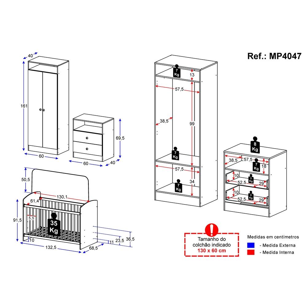 O Quarto Infantil Completo Doçura Multimóveis é produzido em MDP, que garante maior durabilidade e resistência, e possui acabamento acetinado (cerca de 20% de brilho). Com gavetas, cabideiro e prateleiras, o guarda-roupas e cômoda são muito funcionais para deixar o ambiente organizado. O berço possui lastro com 3 regulagens de altura e acompanha o suporte para mosquiteiro que garante noites de sono mais tranquilas. O berço é padrão nacional (tamanho do colchão indicado: 1,30 x 0,60) e certificado pelo INMETRO. Compacto e versátil, é uma ótima opção para ambientes compactos onde você precisa otimizar o espaço. Não acompanha colchão. Conteúdo da Embalagem: 1 (um) guarda-roupas 1 (uma) cômoda 1 (um) berço Dimensões do produto montado: Guarda-Roupas - Altura: 161cm | Largura: 60cm | Profundidade: 40cm Cômoda - Altura: 69,5cm | Largura: 60cm | Profundidade: 40cm Berço - Altura: 91,5cm | Largura: 132,5cm | Profundidade: 68,5cm *Você pode consultar as medidas internas na imagem técnica do produto. *As cores do produto podem sofrer variações de tonalidade de acordo com as configurações do seu dispositivo. Imagem meramente ilustrativa. Decoração não acompanha o produto. O produto será entregue desmontado e não disponibilizamos o serviço de montagem.