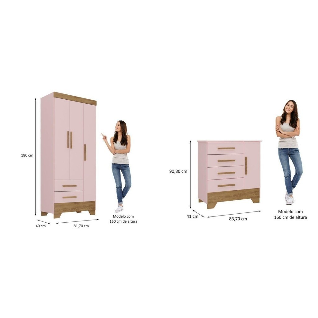 Quarto Infantil Completo Guarda Roupa 3 Portas 2 Gavetas com Cômoda Selene Espresso Móveis Rosa Fosco/Nature