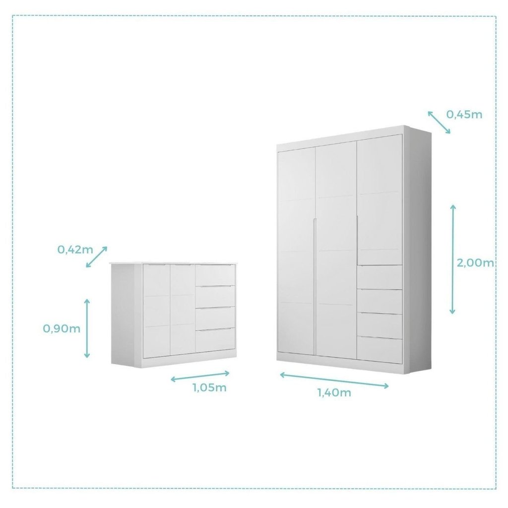 O conjunto de Quarto Infantil Eloá é a solução completa para criar um ambiente organizado, seguro e cheio de charme para as crianças. Projetado para acompanhar as fases do crescimento, oferece funcionalidade e um design que se adapta a diferentes decorações, tornando o cômodo mais importante da casa ainda mais especial. - Estrutura Robusta e Segura: A fabricação 100% em MDF com acabamento em pintura UV acetinada atóxica garante um móvel resistente para o uso diário e, principalmente, seguro para a saúde dos pequenos. - Organização Inteligente: Equipado com corrediças telescópicas que permitem um deslize suave e silencioso das gavetas, o conjunto também conta com cabideiros internos, nichos e prateleiras que otimizam o espaço e facilitam a organização de roupas e brinquedos. - Design Clean e Funcional: As linhas retas e os puxadores do tipo cava (embutidos) conferem um visual moderno e minimalista ao quarto, além de aumentar a segurança por não possuírem peças salientes que possam causar acidentes. - Amplo Espaço de Armazenamento: O guarda-roupas possui 2,00 m de altura, 1,40 m de largura e 0,45 m de profundidade, oferecendo um excelente espaço vertical. A cômoda complementar mede 0,90 m de altura, 1,05 m de largura e 0,42 m de profundidade, perfeita para itens de fácil acesso. Acompanha 1 Guarda-Roupas e 1 Cômoda. Para uma compra certeira: Os itens decorativos das imagens não fazem parte do produto. Confirme se as medidas cabem no seu ambiente, considerando uma pequena folga de até 2 cm para manuseio. Capitonê: Não Garantia: 03 Meses Suporta Até (kg): 75 Pintura Atóxica: Sim Escala de Brilho: Semi-Brilho Ambiente Principal: Quarto Infantil Material Principal: MDF Marca: Phoenix Baby Cor: Branco Cor do Produto: Branco Itens Inclusos: 1 Quarto, kit ferragem e manual de montagem Cor Predominante: Branco Linha ou Coleção: Eloá