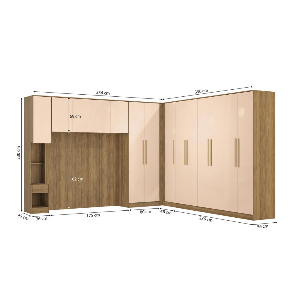 Para quem sempre sonhou com um quarto planejado, o Modulado Adapt da Kappesberg é a escolha certa. Produzido em MDP de 15mm, o que proporciona mais robustez, firmeza e qualidade, o Combo CB1159 conta com sete peças, sendo uma opção completa para quem sempre quis um quarto espaçoso, ideal para organizar roupas e calçados com beleza e funcionalidade. Unindo peças curingas e muito versáteis, os módulos são individuais, permitindo a montagem conforme o seu espaço e preferência. Com altura de 2,30m e 56cm de profundidade, os módulos contam com amplo espaço e uma ótima divisão interna, com nichos de tamanhos diferentes, ideais para guardar calçados e roupas dobradas. Os cabideiros, metálicos e de suporte interno, permitem organizar peças maiores, como casacos e vestidos sem amassar. Já as gavetas, com corrediças telescópicas, garantem uma melhor otimização de espaço, perfeitas para acessórios e peças menores, deixando seu quarto sempre organizado. E para um melhor aproveitamento de espaço na vertical, os aéreos são ótimas opções, permitindo organizar travesseiros e cobertores com facilidade. Além disso, para deixar seu quarto com cara de planejado, o combo conta com painel e cabeceira estofada, acomodando camas de casal queen, de 158cm, tornando seu quarto mais completo e suas noites de sono ainda mais confortáveis. Outros módulos, como a mesa de cabeceira com prateleira tornam o projeto único, garantindo o quarto dos sonhos. E com sete camadas de pintura tanto na parte interna quanto na externa, a caixaria conta com pintura touch na cor nogueira, contando com a textura dos veios da madeira, enquanto que as portas, com pintura na cor macadâmia, possuem acabamento em brilho. Uma combinação moderna e elegante, que garantirá estilo e aconchego ao espaço, ideal para quem busca por um design único, deixando seu quarto perfeito. E para completar os diferenciais do seu quarto modulado, as portas contam com sistema de amortecimento, garantindo um fechamento suave e sem ruídos, e os puxadores em MDF na cor dourada deixarão seu quarto do jeito que você sempre sonhou. Renove seu quarto com toda a qualidade e beleza que o Modulado Adapt da Kappesberg oferece e aproveite cada momento. Informações importantes: As imagens são meramente ilustrativas, não acompanha acessórios; Pode haver variação de cor de acordo com a calibragem da tela onde o produto está sendo visualizado; Todos nossos móveis são entregues desmontados; A montagem é sempre por conta do cliente (orientamos a contratação de um profissional qualificado, o manual de montagem acompanha o produto); O vídeo do produto pode ser genérico, então atente-se às imagens do anúncio para optar pela cor/modelo. Compõe o conjunto 7 peças: 1x Guarda-Roupa 6 Portas 4 Gavetas Kappesberg Adapt Nogueira/Macadâmia; 1x Guarda-Roupa de Canto Reto 1 Porta Kappesberg Adapt Nogueira/Macadâmia; 1x Guarda-Roupa 2 Portas 2 Gavetas Kappesberg Adapt Nogueira/Macadâmia; 1x Armário Aéreo 4 Portas Kappesberg Adapt Nogueira/Macadâmia 175cm; 1x Painel Kappesberg Adapt Nogueira 175cm; 1x Cabeceira Estofada Kappersberg Adapt Veludo Bege 160cm; 1x Complemento 1 Porta 1 Gaveta Kappesberg Adapt Nogueira/Macadâmia; *Obs.: Não acompanha cama, colchão, acessórios, decorações e periféricos; Largura A: 354cm / B: 336cm.