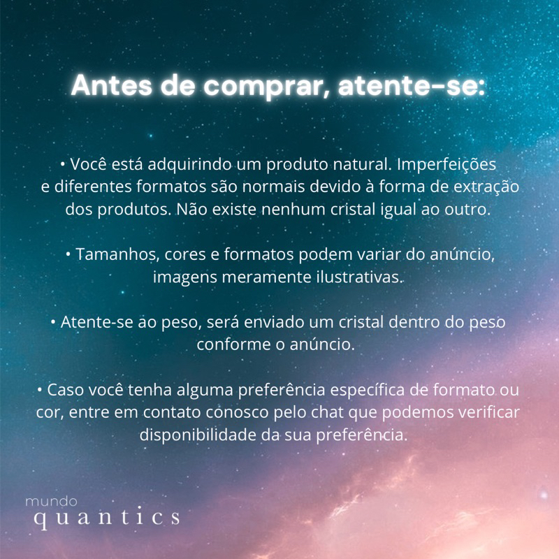 ATENÇÃO!!!! Leia as instruções antes de realizar a sua compra! • As fotos dos produtos são todas produzidas pela Quantics Store. São feitas em luz natural do sol, sendo assim podem ter um tom mais amarelado do que na luz artificial. Além disso, as cores e tonalidades podem variar de monitor para monitor. • Você está adquirindo um produto natural, ou seja, retirado da natureza. Imperfeições e diferentes formatos são normais devido à forma de extração dos produtos. • Não existe nenhuma pedra ou cristal igual ao outro. Eles são únicos e essa é a beleza de adquirir um produto natural: o seu será exclusivo no mundo, assim como suas impressões digitais! • Tamanhos, peso, cores e formatos podem variar do anúncio, imagens meramente ilustrativas. • Fique atento ao limpar e energizar seus cristais. Alguns deles não podem ser expostos a luz do sol ou mergulhados em água. Tente conhecer as propriedades do seu cristal antes dos procedimentos. Não nos responsabilizamos por mau uso. O Quartzo Rosa é a pedra do amor e da paz que possibilita a purificação do corpo emocional através da ativação do Chakra do coração. Ele repele as energias negativas e potencializa as vibrações do amor, possibilita harmonia e paz em relacionamentos estabelecidos e ao ambiente familiar. É capaz de resolver problemas emocionais e de criar um forte campo de acesso ao amor incondicional. Esse é o cristal mais importante para o coração e que ensina a verdadeira essência do amor, possibilitando o entendimento de como amar da forma mais plena possível. Ele purifica intensamente, fortalece e o amor próprio, acalma a mente, elimina preocupações e promove a verdadeira paz interior. Suas poderosas vibrações de amor incondicional podem penetrar no nível celular e reprogramar as células para a alegria e longevidade. Essa capacidade de reprogramação é a fonte do potencial de cura desta pedra que repele as energias negativas e as substitui por vibrações de amor.