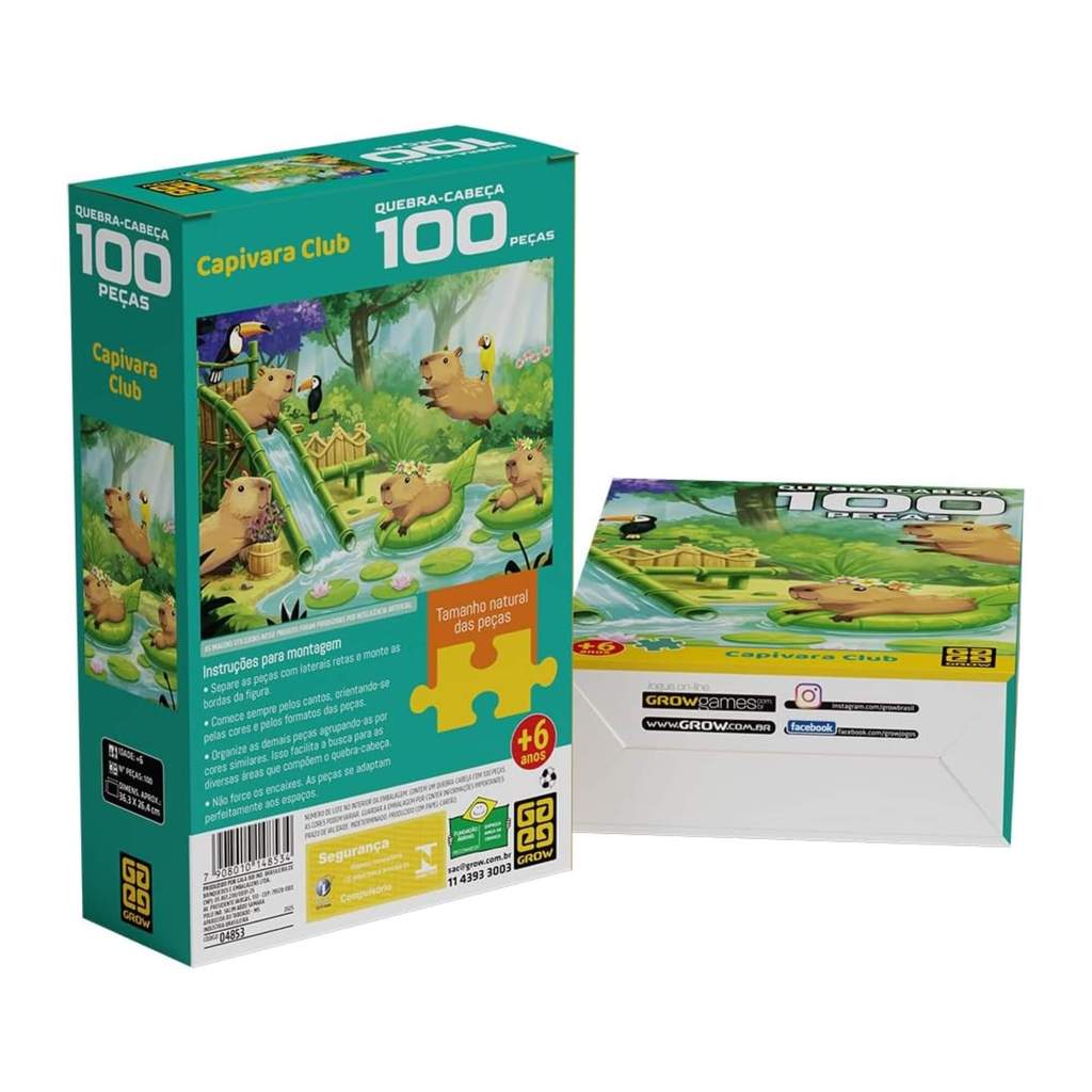 Mergulhe em uma cena mágica e cheia de alegria com este quebra-cabeça de 100 peças! A imagem encantadora mostra um grupo de capivaras se divertindo em um parque natural, rodeadas por tobogãs de bambu, folhas flutuantes e amigos coloridos como tucanos e araras. Com cores vibrantes e detalhes fofos, este quebra-cabeça estimula a imaginação e desenvolve o raciocínio lógico de forma divertida. Ideal para crianças e adultos que amam natureza, animais e momentos de descontração em família! Tamanho da imagem : 36,3 x 26,4 cm Idade recomendada: a partir de 6 anos Monte peça por peça e descubra a beleza dessa floresta encantada! Especificações técnicas Faixa Etária: A partir de 6 anos Tamanho da Imagem: 36,3 x 26,4 cm Dimensões da embalagem: 23 x 14,5 x 6,1 cm Participantes: 1 ou mais Certificação Inmetro: CE-BRI/ICEPEX-N 01264-25 - NM300-2004 OCP 0046 Características: - Marca:GROW - Modelo:04853 *Imagens Meramente Ilustrativas* Conteúdo da Embalagem: - 1 Quebra-cabeça com 100 peças
