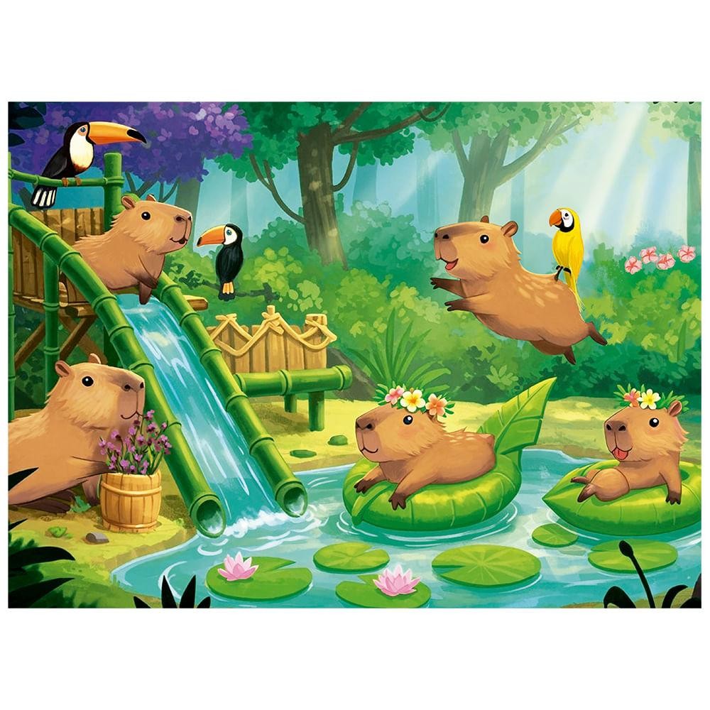 Quebra-cabeça 100 peças Capivara Club Mergulhe em uma cena mágica e cheia de alegria com este quebra-cabeça de 100 peças! A imagem encantadora mostra um grupo de capivaras se divertindo em um parque natural, rodeadas por tobogãs de bambu, folhas flutuantes e amigos coloridos como tucanos e araras. Com cores vibrantes e detalhes fofos, este quebra-cabeça estimula a imaginação e desenvolve o raciocínio lógico de forma divertida. Ideal para crianças e adultos que amam natureza, animais e momentos de descontração em família! Tamanho da imagem : 36,3 x 26,4 cm Idade recomendada: a partir de 6 anos Monte peça por peça e descubra a beleza dessa floresta encantada!