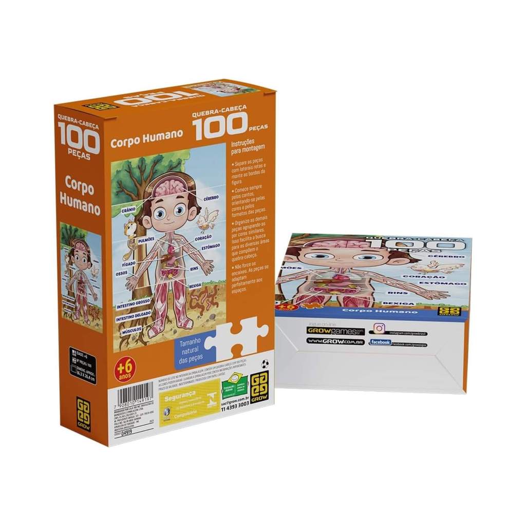 Descobrindo o Corpo Humano – Quebra-Cabeça Educativo para Crianças! Transforme o aprendizado em uma aventura divertida com nosso quebra-cabeça infantil de 100 peças com o tema Corpo Humano! Quando montado, revela um simpático e colorido desenho que mostra o corpo por dentro, com ossos, músculos, crânio, cérebro, coração, pulmões e muito mais! Uma maneira lúdica e visual de despertar a curiosidade e ensinar o funcionamento do corpo humano de forma leve e criativa. Benefícios: Estimula o raciocínio lógico Desenvolve a coordenação motora Incentiva o aprendizado de forma divertida Ideal para crianças em fase escolar Indicado para crianças a partir de 6 anos Quebra-cabeça de 100 peças A partir de 6 anos Dimensões 36,3 x 24,6 cm Especificações técnicas Faixa Etária: A partir de 6 anos Tamanho da Imagem: 36,3 x 26,4 cm Dimensões da embalagem: 22,6 x 14,5 x 6,0 cm Participantes: 1 ou mais Certificação Inmetro: CE-BRI/ICEPEX-N 01264-25 - NM300-2004 OCP 0046 Outras Informações: Não recomendávél para menores de 3 anos por conter partes pequenas Características: - Marca:Grow - Modelo:04919 *Imagens Meramente Ilustrativas* Conteúdo da Embalagem: - 1 quebra-cabeça de 100 peças