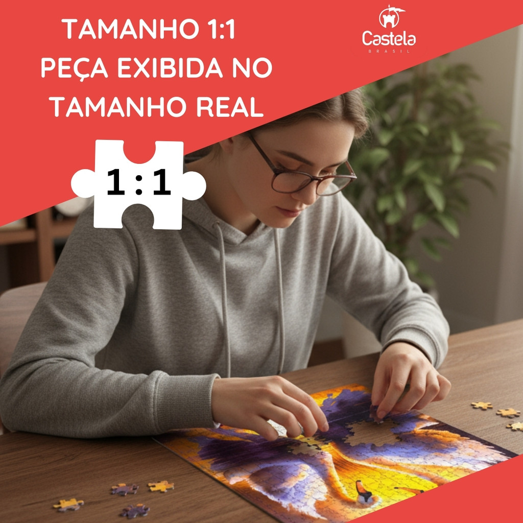 DESCRIÇÃO DO PRODUTO Monte uma verdadeira obra de arte com este lindo quebra-cabeça de 1000 peças, trazendo a delicadeza dos cisnes em um romântico pôr do sol. Além de ser uma atividade divertida e relaxante, ele também estimula a concentração, paciência e raciocínio lógico. - Tamanho montado: 70 cm x 50 cm - Contém 1000 peças de alta qualidade - Peças resistentes e bem encaixadas Perfeito para presentear amantes de quebra-cabeças e para quem busca uma atividade relaxante e estimulante! CARACTERÍSTICAS TÉCNICAS: Conteúdo da Embalagem: 1 Quebra Cabeça Por do Sol Cisnes 1000 Peças Dimensões Aproximadas do Produto: 70 cm x 50 cm (Largura x Comprimento/Profundidade). Dimensões Aproximadas da Embalagem: 7 cm x 25 cm x 37 cm (Altura x Largura x Comprimento/Profundidade). Material/Composição: Papel Cartão Idade Mínima Recomendada: A partir de 14 Anos Participantes: A partir de 1 ou mais pessoas Alimentação: Não se aplica Marca: Castela Referência: CBS0429 Outras informações: As cores podem variar entre as imagens mostradas acima e o produto. Imagens meramente ilustrativas. Aviso: As informações e imagens divulgadas são de total responsabilidade do fabricante/fornecedor. Produto lacrado e disponível a pronta entrega para todo Brasil! APROVADO PELO INMETRO