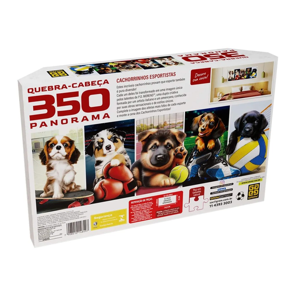 Prepare-se para uma maratona de fofura! Cinco cachorrinhos super atléticos estão prontos para competir em seus esportes favoritos — e você é o técnico dessa equipe cheia de charme. Criados pela dupla artística P.D. MORENO, cada cãozinho foi ilustrado com um estilo único e cheio de personalidade. Monte esse divertido quebra-cabeça e descubra quem vai levar a medalha de ouro da fofura! Especificações Técnicas Faixa Etária: A partir de 8 anos Tamanho da Imagem: 74,8 x 25 cm Dimensões da embalagem: 36,6 x 23,4 x 7,1 cm Participantes: 1 ou mais Certificação Inmetro: CE-BRI/ICEPEX-N 01264-25 - NM300-2004 OCP 0046 Características: - Marca:Grow - Modelo:04849 *Imagens Meramente Ilustrativas* Conteúdo da Embalagem: - 01x Quebra-cabeça 350 peças Panorama Cachorrinhos Esportistas