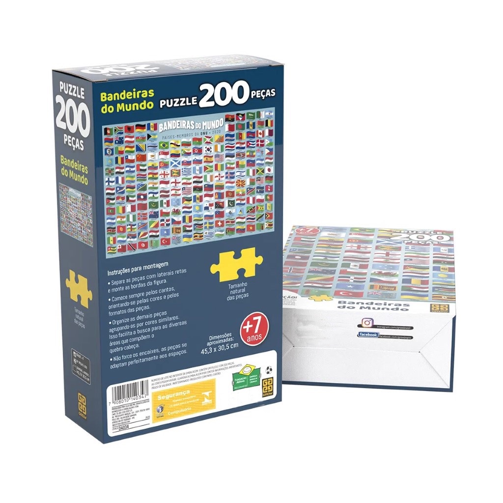 Bandeiras do Mundo é um quebra-cabeça para aprender e se divertir! Possui 200 peças que se encaixam e formam os países membros da ONU - 2020. É um puzzle didático, que além de superdivertido, introduz esse conceito às crianças. Mais que um passatempo divertido, os quebra-cabeças desenvolvem o raciocínio, relaxam e se transformam num autêntico hobby. Dimensões Aproximadas do Produto: 45,3 x 30,5 cm Dimensões Aproximadas da Embalagem: 27,5 x 16,4 x 7cm (Altura x Largura x Comprimento/Profundidade)