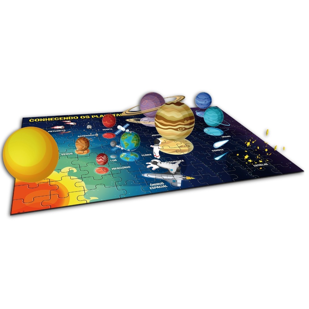 QUEBRA CABEÇA CONHECENDO OS PLANETAS 100 PEÇAS MADEIRA REFLORESTADA XALINGO APP INTERATIVO JOGO SOL