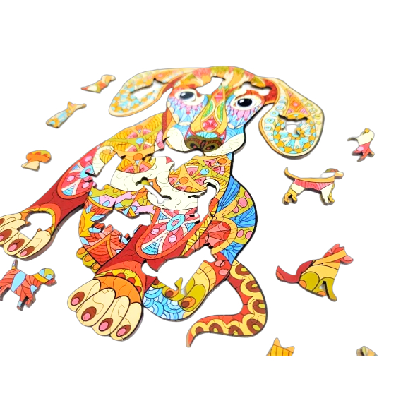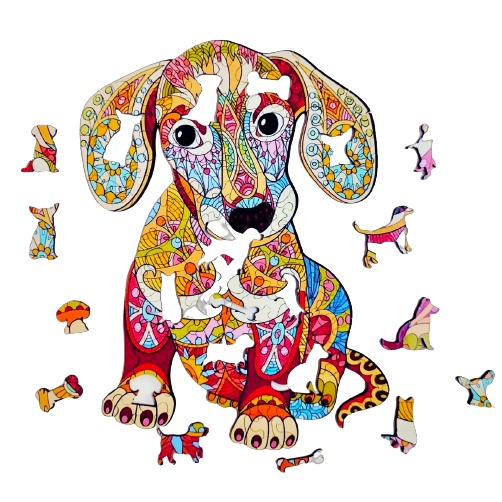 Quebra-cabeça em madeira tema cachorro - Caixa de madeira - 134 peças tamanho 19x23cm Tamanho A4 Peças com formatos únicos Dachshund
