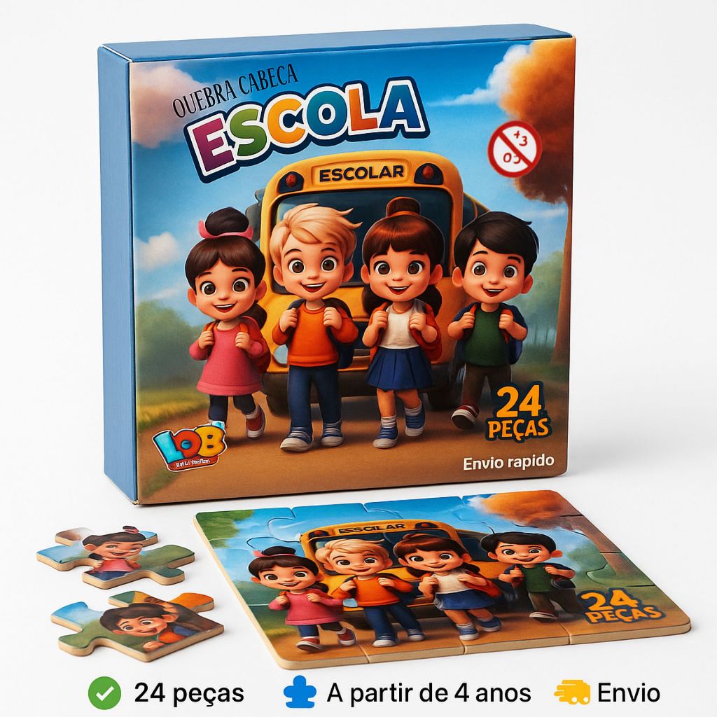 🧩 Quebra-Cabeça Infantil – Tema Escola | 24 Peças | A Partir de 4 Anos Diversão, aprendizado e desenvolvimento em um só brinquedo! O Quebra-Cabeça "Escola" é ideal para estimular a coordenação motora, a percepção visual e o raciocínio lógico das crianças. Com 24 peças grandes e coloridas, ele é perfeito para mãos pequenas e seguro para crianças a partir de 4 anos. 🎨 Características do Produto: Tema: Escola – com crianças felizes indo para o colégio e um ônibus escolar ao fundo. Número de peças: 24 Indicação etária: A partir de 4 anos Material: MDF Dimensões aproximadas montado: 16 x 16 cm Marca: IOB Brinquedos Certificação de segurança: Produto certificado pelo INMETRO ✅ Benefícios: Estimula o desenvolvimento cognitivo Favorece a concentração e a paciência Atividade educativa e divertida Ideal para brincar sozinho ou com a família ⚠️ Aviso: Não recomendado para menores de 3 anos por conter peças pequenas que podem ser engolidas. 🚀 Envio Rápido e Seguro!
