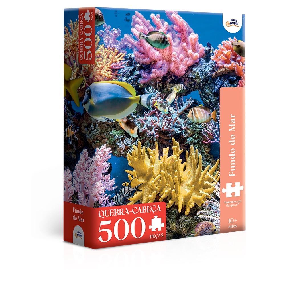 Quebra Cabeça Fundo do Mar, 500 Peças. Feito em papel cartão, fácil de usar e guardar, resistente. Dimensões Montado: 47,8 x 34,8 cm.