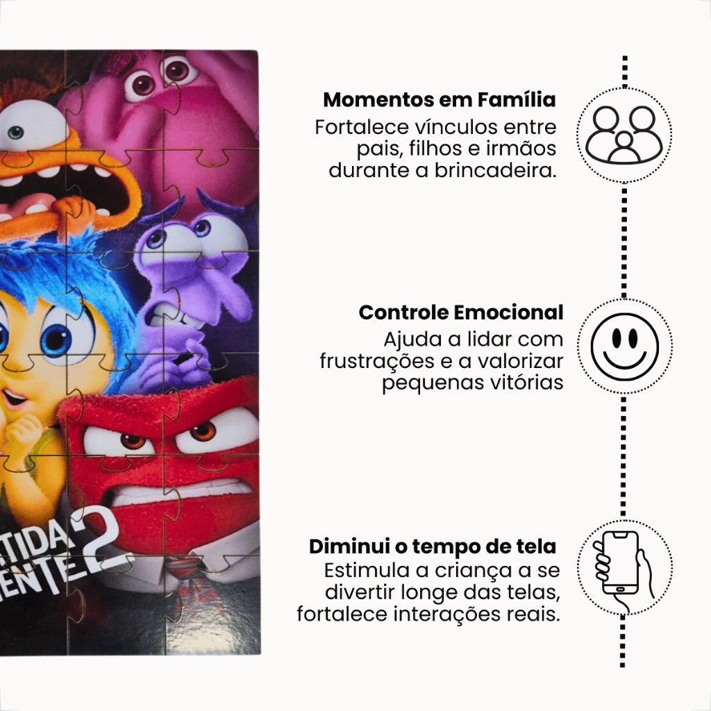 Quebra-Cabeça Divertida Mente 2 – 30 Peças em MDF Entre no universo emocionante e colorido de Divertida Mente 2 com este incrível quebra-cabeça, que traz à vida os personagens e cenários mais adorados do filme. Uma atividade educativa e divertida, perfeita para crianças e toda a família. DIMENSÕES - 20cm de largura - 25cm de altura QUANTIDADE DE PEÇAS - 30 peças BENEFÍCIOS DO PRODUTO - Desenvolvimento Cognitivo: Estimula a concentração, o raciocínio lógico, a resolução de problemas e a coordenação motora fina. - Arte em Detalhes: Cada peça recebe adesivagem com imagens nítidas e cores vibrantes, garantindo um visual fiel e encantador. - Qualidade e Durabilidade: Produzido em MDF resistente, com estabilidade e longa vida útil. - Diversão em Família: Ideal para criar momentos especiais de interação, cooperação e aprendizado entre crianças e adultos. - Compacto e Prático: Tamanho ideal para montar em qualquer superfície plana, seja em casa, na escola ou em viagens. - Acabamento Premium: Adesivo protetor de alta qualidade, toque suave e peças fáceis de manusear. - Encaixe Preciso: Cada peça foi projetada para se encaixar perfeitamente, formando uma imagem completa que transmite toda a magia do filme. Um quebra-cabeça que une diversão, aprendizado e qualidade, garantindo horas de entretenimento e estímulo para os pequenos.