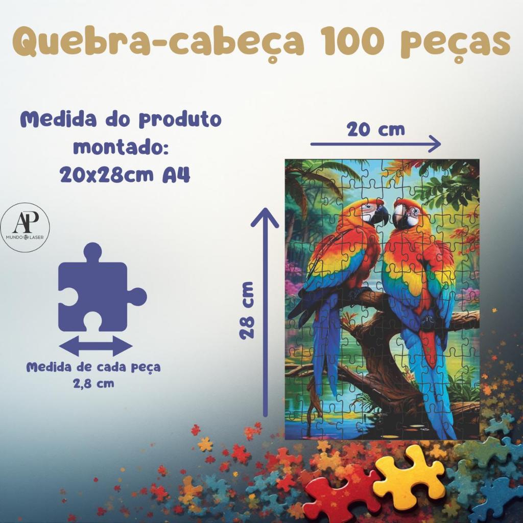 Bem-vindo a AP Mundo Laser, tudo do mundo laser para você. Detalhes sobre o produto: •Feito em MDF resistente •Estampa de alta qualidade •Desenvolve o raciocínio e a coordenação motora. Sobre o Produto: O produto é enviado dentro de: 1-Caixa Em MDF Cru para Guardar as peças. Cada quebra-cabeça acompanha 1 foto para auxiliar na montagem. Medida de cada Quebra-cabeça 100 peças : Largura: 20 cm Profundidade: 28 cm Espessura do MDF: 3 mm Cada peça tem em média 2,8 cm - Impressão em Alta Qualidade - Nossos produtos recebem laminação em BOPP, para aumentar a qualidade, Brilho e durabilidade. - Acabamento: Corte a Laser - Limpeza: Para limpeza utilizar pano levemente umidecido com água (Não utilizar produtos químicos), para garantir maior durabilidade ao produto. Estoque e envio: Temos todos em estoque a pronto envio Garantia: 1 Mês "Para compras personalizadas favor entrar em contato conosco, será maior prazer em atender você." Ap Mundo Laser