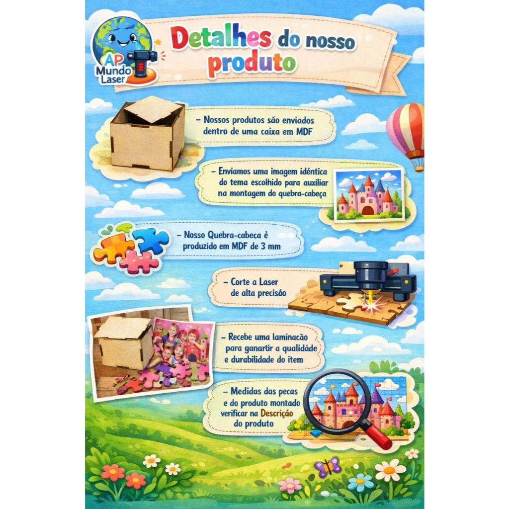 Bem-vindo a AP Mundo Laser, tudo do mundo laser para você. Detalhes sobre o produto: •Feito em MDF resistente •Estampa de alta qualidade •Desenvolve o raciocínio e a coordenação motora. Sobre o Produto: O produto é enviado dentro de: 1-Caixa Em MDF Cru para Guardar as peças. Cada quebra-cabeça acompanha 1 foto para auxiliar na montagem. Medida de cada Quebra-cabeça 100 peças : Largura: 20 cm Profundidade: 28 cm Espessura do MDF: 3 mm Cada peça tem em média 2,8 cm - Impressão em Alta Qualidade - Nossos produtos recebem laminação em BOPP, para aumentar a qualidade, Brilho e durabilidade. - Acabamento: Corte a Laser - Limpeza: Para limpeza utilizar pano levemente umidecido com água (Não utilizar produtos químicos), para garantir maior durabilidade ao produto. Estoque e envio: Temos todos em estoque a pronto envio Garantia: 1 Mês "Para compras personalizadas favor entrar em contato conosco, será maior prazer em atender você." Ap Mundo Laser
