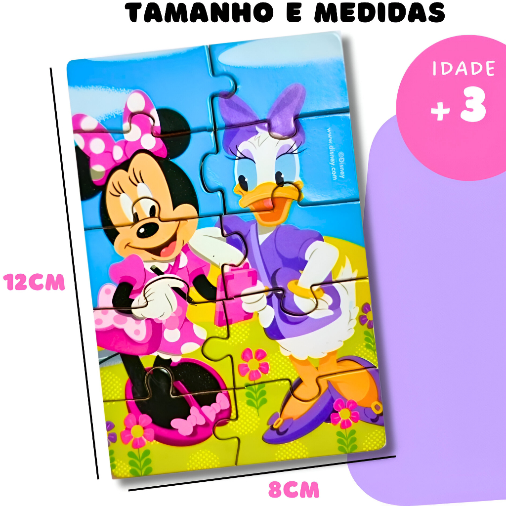 Mini Quebra Cabeça MINNIE A Minnie é uma personagem amada por crianças e adultos, ela tem um encanto especial que faz todo mundo se apaixonar por ela, e por isso trazemos essa incrível personagem em um quebra cabeça lindo e cheio de encanto. O nosso super jogo de quebra cabeça Minnie, vai trazer muita diversão e desenvolver bastante o raciocínio das crianças. Cada quebra Cabeça contém 10 peças, ilustrada com os personagens Minnie. O Jogo tem desing incrível, suas cores são vibrantes, e todas as peças são em madeira, são 6 modelos de quebra cabeça para você colecionar e o melhor de tudo é que você pode usar esses jogos para presentear como lembrancinha em festas. OBS: Um brinquedo perfeito para presentear quem você ama e serve de lembrancinhas em aniversários DESCRIÇÃO: - Mini Quebra Cabeça 10 peças - Tema: Minnie( Estampas variadas) - Em Madeira - Kit Com 1 Unidade e 6 Unidades OBS: O Anúncio Contém Variação kit com 1 unidade e 6 Unidades. Produtos à pronta entrega em estoque físico, postagem dos produtos em até 24horas após a confirmação do pedido.