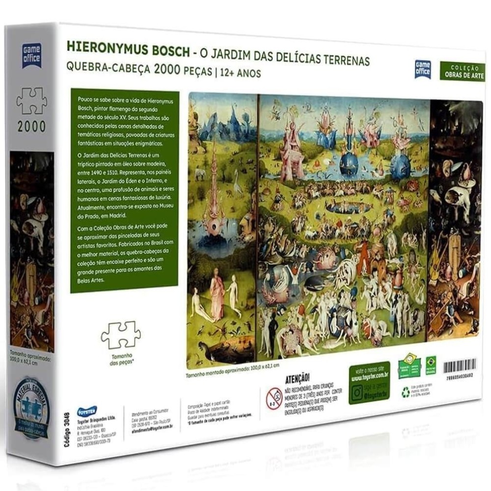 ***PRODUTO TOYSTER EM PORTUGUÊS, ORIGINAL, OFICIAL, LACRADO E COM NOTA FISCAL*** QUEBRA CABEÇA O JARDIM DAS DELÍCIAS TERRENAS HIERONYMUS BOSCH 2000 PEÇAS TOYSTER PUZZLE OBRA DE ARTE Informações Técnicas: - Material: Papel e Papel Cartão - Contém: 2000 peças - EAN: 7896054030482 - Código: 3048 - Produto certificado: INMETRO - Imagem montada (aproximadamente): 100,0 x 62,1 cm - Dimensões: 40 x 27 x 6 cm - Peso: 1,120g - QUEBRA-CABEÇA - 12+ ANOS - Marca: TOYSTER - Linha: Game Office - Garantia: Contra defeitos de fabricação - Prazo de Validade: Indeterminado Obs: O tamanho de cada peça pode sofrer variações. Faça o descarte consciente e preserve o meio ambiente. Imagens meramente ilustrativas. Este produto contém material reciclado e é 100% reciclável. ATENÇÃO! NÃO RECOMENDÁVEL PARA CRIANÇAS MENORES DE 3 (TRÊS) ANOS POR PODER GERAR PARTE(S) PEQUENA(S) QUE PODE(M) SER ENGOLIDA(S) OU ASPIRADA(S). Pouco se sabe sobre a vida de Hieronymus Bosch, pintor flamengo da segunda metade do século XV. Seus trabalhos são conhecidos pelas cenas detalhadas de temáticas religiosas, povoadas de criaturas fantásticas em situações enigmáticas. O Jardim das Delícias Terrenas é um triptico pintado em óleo sobre madeira, entre 1490 e 1510. Representa, nos painéis laterais, o Jardim do Eden e o Inferno, e no centro, uma profusão de animais e seres humanos em cenas fantasiosas de luxúria. Atualmente, encontra-se exposto no Museu do Prado, em Madrid. Com a Coleção Obras de Arte você pode se aproximar das pinceladas de seus artistas favoritos. Fabricados no Brasil com o melhor material, os quebra-cabeças da coleção têm encaixe perfeito e são um grande presente para os amantes das Belas Artes. --------------------------------------------------- SEJA MUITO BEM VINDO(A) A LOJA DE BRINQUEDOS DO CANAL 40 POR QUÊ COMPRAR NA LOJA DE BRINQUEDOS DO CANAL 40? *Enviamos seu pedido sempre no mesmo dia ou no máximo no próximo dia útil dependendo do horário da sua compra! *Produtos lacrados, originais e oficiais da mais alta qualidade; *Experiência única de compra (incluindo a experiência olfativa - você sentirá nosso cheiro); *Todos os nossos produtos estão à pronta entrega em nosso estoque físico aqui no Brasil; *Seu pedido será enviado com segurança e agilidade; IMPORTANTE: Tenha tranquilidade de comprar com quem está disposto a te oferecer o melhor atendimento, caso tenha algum problema após a compra, conte com nossa equipe de pós venda para solucioná-lo! A LOJA DE BRINQUEDOS DO CANAL 40 tem a missão de garantir a satisfação total do seu cliente, tanto nos produtos quanto no atendimento. Assim estabelecemos uma relação única de confiança! Não encontrou o que procurava? Clique na foto da nossa logo para entrar em nossa loja e ver todos os nossos produtos OU nos mande uma mensagem diretamente aqui pelo chat. SERÁ UM PRAZER ATENDÊ-LO(A)! --------------------------------------------------- MUITO PRAZER, ME CHAMO FELIPE CAMARGO, SOU DONO, CEO E CRIADOR DE CONTEÚDO DO CANAL 40. DESDE JÁ, DEIXO AQUI O MEU MUITO OBRIGADO!!! CANAL 40 - LOJA DE BRINQUEDOS LTDA DEIXE SUA CRIANÇA INTERIOR FELIZ E APROVEITE!