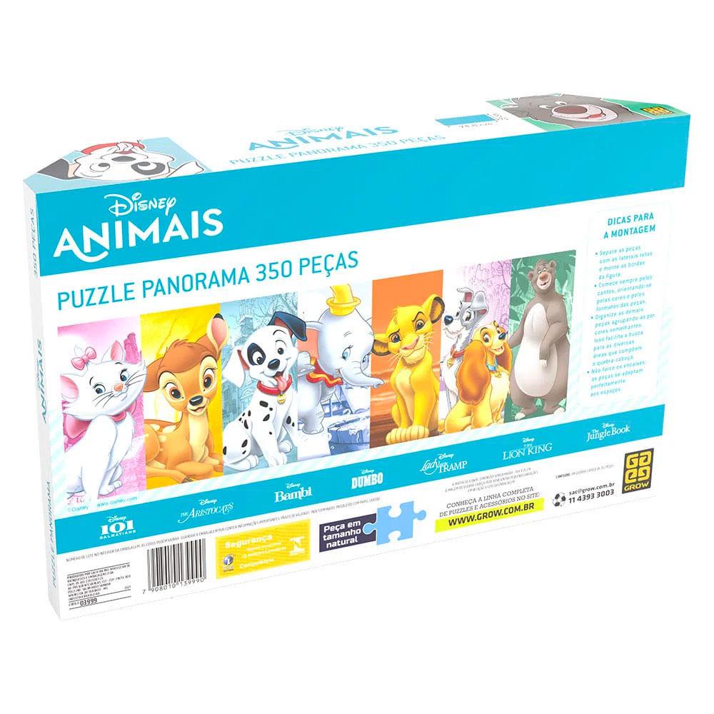 Quebra Cabeça Panorama Disney 350 peças- Grow Com o Quebra Cabeça Panorama Disney a criança pode ter o seu personagem favorito da infância. O Quebra Cabeça é composto por 350 peças que se encaixam perfeitamente, formando uma linda imagem panorâmica com os personagens do filme 101 Dálmatas, Aristogatas Bambi, Dumbo, O Rei Leão, A Dama e o Vagabundo e o Menino Lobo. Idade recomendada: A partir de 08 Anos.