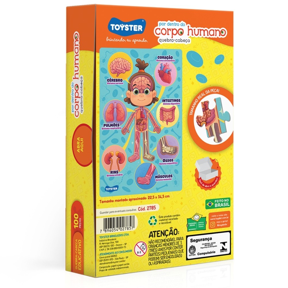 SEJA MUITO BEM VINDO(A) A LOJA DE BRINQUEDOS DO CANAL 40 POR QUÊ COMPRAR NA LOJA DE BRINQUEDOS DO CANAL 40? *Enviamos seu pedido sempre no mesmo dia ou no máximo no dia seguinte dependendo do horário da sua compra! *Produtos lacrados, originais e oficiais da mais alta qualidade; *Experiência única de compra (incluindo a experiência olfativa - você sentirá nosso cheiro); *Todos os nossos produtos estão à pronta entrega em nosso estoque físico aqui no Brasil; *Sempre temos novos cupons de descontos especiais; *Seu pedido será enviado com segurança e agilidade; *Possibilidade de frete grátis; *Possibilidade de parcelamento; IMPORTANTE: Tenha tranquilidade de comprar com quem está disposto a te oferecer o melhor atendimento, caso tenha algum problema após a compra, conte com nossa equipe de pós venda para solucioná-lo! A LOJA DE BRINQUEDOS DO CANAL 40 tem a missão de garantir a satisfação total do seu cliente, tanto nos produtos quanto no atendimento. Assim estabelecemos uma relação única de confiança! --------------------------------------------------- ***PRODUTO TOYSTER EM PORTUGUÊS, ORIGINAL, OFICIAL, LACRADO E COM NOTA FISCAL*** QUEBRA CABEÇA POR DENTRO DO CORPO HUMANO 100 PEÇAS TOYSTER PUZZLE BRINQUEDOS EDUCATIVOS DIDÁTICO JOGO INFANTIL Quebra-cabeça educativo Uma forma lúdica e brilhante de ensinar as crianças sobre o corpo humano. Informações Técnicas: - Material: Papel - Papel Cartão - Contém: 100 peças - EAN: 7896054027857 - Código: 2785 - Produto certificado REGISTRO: 000520/2022 - Dimensões: 19,0 x 27,0 x 3,5 cm - Imagem montada (aproximadamente): 22,5 x 34,5 cm - Peso: 195g - QUEBRA-CABEÇA EDUCATIVO - 6+ ANOS - TOYSTER - Garantia: Contra defeitos de fabricação - Prazo de Validade: Indeterminado Obs: O tamanho de cada peça pode sofrer variações ATENÇÃO! NÃO RECOMENDÁVEL PARA CRIANÇAS MENORES DE 3 (TRÊS) ANOS POR PODER GERAR PARTE(S) PEQUENA(S) QUE PODE(M) SER ENGOLIDA(S) OU ASPIRADA(S). --------------------------------------------------- Não encontrou o que procurava? Clique na foto da nossa logo para entrar em nossa loja e ver todos os nossos produtos OU nos mande uma mensagem diretamente aqui pelo chat. SERÁ UM PRAZER ATENDÊ-LO(A)! --------------------------------------------------- MUITO PRAZER, ME CHAMO FELIPE CAMARGO, SOU DONO, CEO E CRIADOR DE CONTEÚDO DO CANAL 40. DESDE JÁ, DEIXO AQUI O MEU MUITO OBRIGADO!!! CANAL 40 - LOJA DE BRINQUEDOS LTDA DEIXE SUA CRIANÇA INTERIOR FELIZ E APROVEITE!