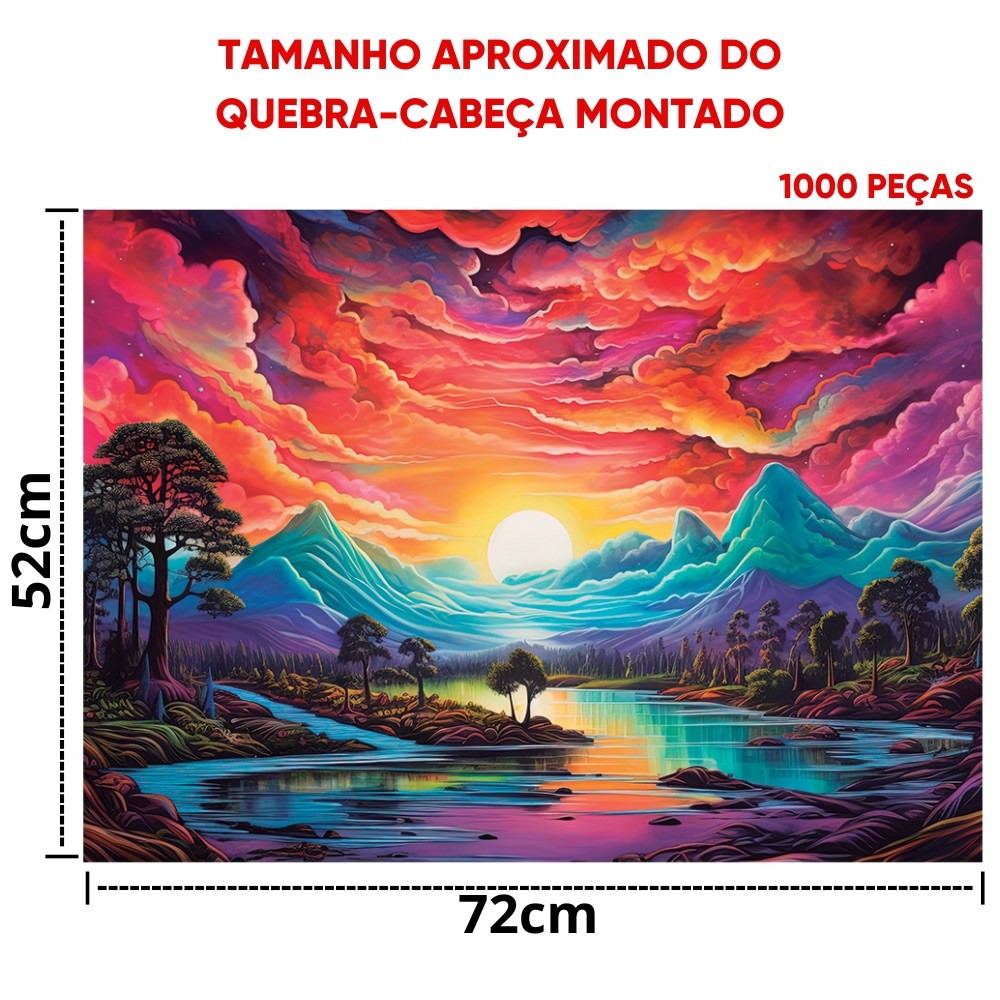***PRODUTO GGB BRINQUEDOS EM PORTUGUÊS, ORIGINAL, OFICIAL, LACRADO E COM NOTA FISCAL*** QUEBRA CABEÇA PÔR DO SOL 1000 PEÇAS GGB BRINQUEDOS PUZZLE PAISAGEM PONTO TURÍSTICO QUADRO ÁRVORE RIO Informações Técnicas: - Material: Papel de gramaturas variadas - Contém: 1000 peças - EAN: 7898570574266 - Código: 1098 - Produto certificado: INMETRO - Imagem montada (aproximadamente): 72 x 52 cm - Dimensões: 39 x 24 x 5 cm - Peso: 540g - QUEBRA-CABEÇA - 10+ ANOS - Marca: GGB - Garantia: Contra defeitos de fabricação - Prazo de Validade: Indeterminado Obs: O tamanho de cada peça pode sofrer variações. Faça o descarte consciente e preserve o meio ambiente. Imagens meramente ilustrativas. ATENÇÃO! NÃO RECOMENDÁVEL PARA CRIANÇAS MENORES DE 3 (TRÊS) ANOS POR PODER GERAR PARTE(S) PEQUENA(S) QUE PODE(M) SER ENGOLIDA(S) OU ASPIRADA(S). Pôr do Sol Ilustração no estilo de pintura que retrata uma paisagem perene, com um cenário de natureza exuberante, extraordinariamente cativante. Uma extensão de terra repleta de árvores, com pinheiros majestosos e densos, cobertos por montanhas incríveis. No céu, as nuvens em degradê e o sol adicionam um toque de magia e encanto à cena. As cores suaves e fluidas contrastam lindamente com o verde intenso das árvores, criando uma atmosfera mágica e serena. A luz do sol filtrada através das nuvens, contribuindo para a pintura de cores suaves e a sensação de serenidade na paisagem. Cada tonalidade é representada com cuidado, mesclando-se suavemente no céu e para criar uma transição suave e hipnotizante, e evoca uma sensação de calma, beleza natural e maravilha, transportando quem a contempla para um lugar de paz e admiração diante da natureza em sua forma mais sublime.