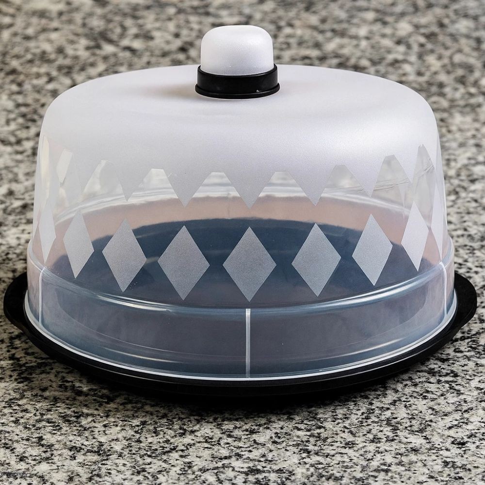 Queijeira Plástica Redonda com Prato e Tampa Decorada Translúcida e Base Preta – Protege e Conserva