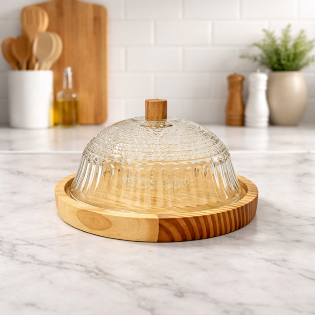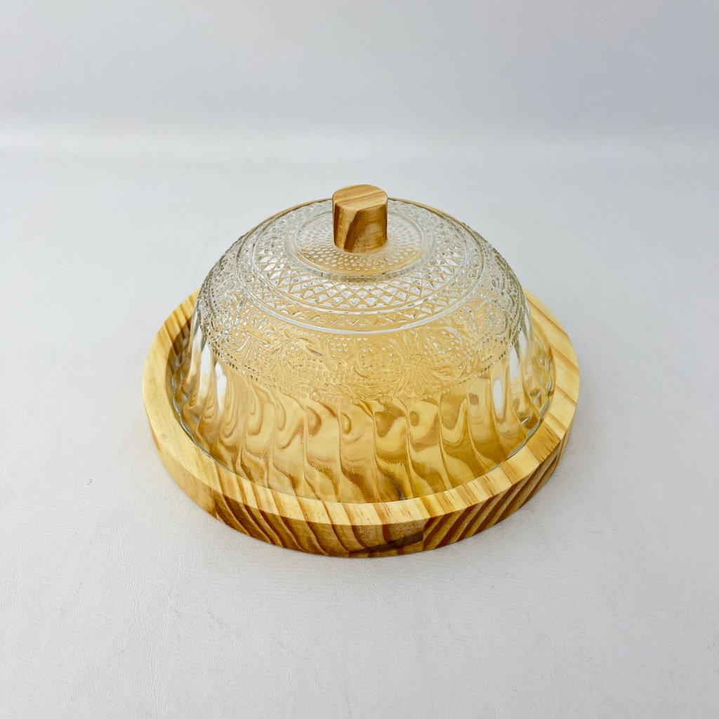 Queijeira Rústica Artesanal em Vidro e Madeira Pinus – Estilo Boho Chic 18 cm