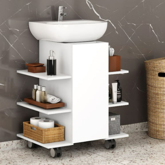 Gabinete para banheiro destinado a lavatórios de coluna. Seu design permite que o gabinete fique posicionado abaixo do lavatório entre a coluna, possui 4 pés com regulagem de 3cm e um total de 6 nichos. Elaborado em MDP com espessuras de 15 mm. Pintura da superfície em verniz poliéster brilhante, com secagem UV e impressão a laser. Acabamento nas bordas com fita de papel decorativo aplicado mecanicamente por sistema hot melting. Limpar com flanela ou pano macio seco, não utilizar produtos abrasivos, desengordurantes, álcool ou solvente. Não expor o produto diretamente à luz solar e à umidade Dimensões do produto: Gabinete: Altura: 59,20cm Largura: 53,90cm Profundidade: 37,20cm Conteúdo da embalagem: - 1 Gabinete INFORMAÇÕES IMPORTANTES: - É de inteira responsabilidade do cliente a montagem do produto e/ou instalação, assim como possíveis avarias provenientes de manuseio inadequado; - Mantenha as informações de contato e endereço de entrega atualizado para entrarmos em contato, caso seja necessário; - Fique atento, nossas cores podem sofrer alterações dependendo do seu monitor; - ANTES DE INSTALAR O SEU PRODUTO, Verifique se há alguma peça avariada, caso esteja, prestaremos a devida assistência dentro do prazo da garantia.