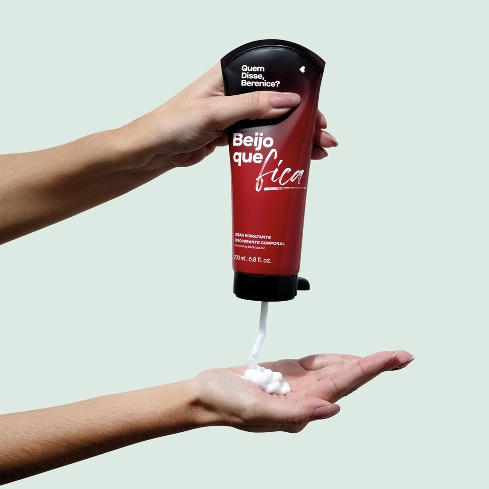 A Loção Hidratante Desodorante Beijo que Fica oferece hidratação para a pele com o cheiro do Desodorante Colônia Beijo que Fica. O uso combinado dos dois produtos potencializa a perfumação e deixa a pele gostosa assim como um beijo. Enquanto perfuma, a loção corporal hidrata a pele por até 24 horas e a deixa com um toque sedoso e aveludado que é super gostoso e viciante de sentir. Ela também confere proteção para a pele graças à sua ação desodorante. O creme corporal tem toque seco e absorve rapidamente na pele garantindo a hidratação que o seu corpo precisa sem deixar aquele aspecto pegajoso. A loção possui fórmula vegana e é dermatologicamente testada. O resultado é uma pele hidratada e perfumada com a fragrância que fica assim como um beijo. SOBRE A LINHA BEIJO QUE FICA Quem Disse, Berenice? Conta a história de uma mulher, que vai atrás da paixão. Ela beija com vontade e sentimento. Beijo no canto da boca, na trave, beijo cheiroso, com chamego. O que conta é a vontade. E se o beijo acerta em cheio? Daqueles que fica grudado... Ela se entrega por inteiro, pra beijar sem medo e fazer tudo durar mais que o beijo! Nenhum produto Quem Disse, Berenice? é Testado em animais. *Ingredientes atualizados na data desta publicação. Mas é importante lembrar de sempre verificar a embalagem, a informação mais atual é a do rótulo do produto. **** IMPORTANTE: Não vendemos para contas CNPJ, evite que seu pedido seja cancelado! ****