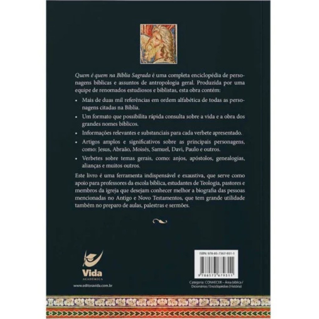 Quem é quem na Bíblia Sagrada é uma completa enciclopédia de personagens bíblicos e assuntos de Antropologia geral. Produzida por uma equipe de renomados estudiosos e biblistas, esta obra contém: — Mais de duas mil referências em ordem alfabética de todos os personagens citados na Bíblia; — Um formato que possibilita rápida consulta sobre a vida e a obra dos grandes nomes bíblicos; — Informações relevantes e substanciais para cada verbete apresentado; — Artigos amplos e significativos sobre os principais personagens, como Jesus, Abraão, Moisés, Samuel, Davi, Paulo e outros; — Verbetes sobre temas gerais, como anjos, apóstolos, genealogias, alianças e muitos outros. Este livro é uma ferramenta de estudo e pesquisa que não pode faltar na biblioteca do estudioso das Sagradas Escrituras. Detalhes do Produto: Autor: Paul Gardner Editora: Vida Acabamento: Brochura Dimensões: 16 larg. X 23 alt. Número de páginas: 688