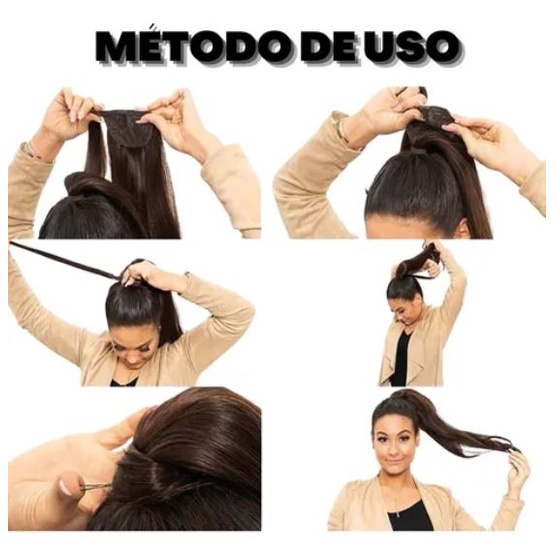 1 Aplique Rabo De Cavalo Com Faixa que camufla com cabelo p/ finalização de penteados MATERIAL: Sintético de Fibra ORGÂNICA (semelhante a cabelo humano) COMPRIMENTO: 70 CM PESO: 130 GRAMAS Aceita temperatura até 180º Obs.: Estes cabelos embaraçam facilmente por serem finos como cabelo humano. Após o uso é preciso cuidar! Molhar com um pouco de água e algum creme hidratante. Penteie em pequenas mechas delicadamente das pontas a parte superior dos fios sem encostar os dentes do pente na costura para que não arrebente a costura. **Eles também podem soltar fios pois são levemente costurados.