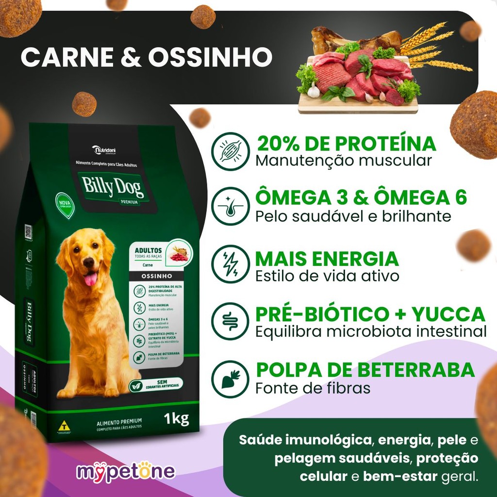 🐶 Ração Billy Dog Ossinho Carne - Nutrição Premium para Cães Adultos Proporcione ao seu melhor amigo uma refeição que une sabor irresistível e saúde completa! A Billy Dog Ossinho Carne é uma ração Premium formulada especialmente para cães adultos de todos os portes. Com um formato divertido de ossinhos, ela não apenas alimenta, mas também ajuda a manter os dentes do seu pet limpos e saudáveis através da mastigação. ✨ Por que escolher a Billy Dog? - Pele e Pelo de dar inveja: Rica em Ômega 3 e 6 para um brilho incrível. - Adeus Cheiros Fortes: Com Extrato de Yucca e Prebióticos (MOS), que reduzem o odor e o volume das fezes. - Digestão Nota 10: Contém polpa de beterraba, uma fibra natural que cuida do intestino. - Saúde Bucal em Dia: O formato de ossinho ajuda a combater o tártaro de forma natural. 📊 Informações Técnicas: - Proteína Bruta: 20% (Alta digestibilidade para músculos fortes). - Indicação: Cães Adultos (Todos os portes). - Sabor: Carne. - Diferenciais: Sem corantes artificiais exagerados e com equilíbrio vitamínico-mineral. 📝 Composição de Qualidade: Milho integral, farinha de carne e ossos, farinha de vísceras, farelo de arroz, gordura animal estabilizada, polpa de beterraba, extrato de yucca schidigera e premix vitamínico completo. ❤️ Benefícios que você percebe no dia a dia: 1- Mais Vitalidade: Seu cão com muito mais energia para brincar. 2- Higiene Facilitada: Fezes mais firmes e com menos odor. 3- Pelagem Macia: Reduz a queda e aumenta o brilho dos fios. 4- Satisfação Garantida: Sabor que os cães amam!