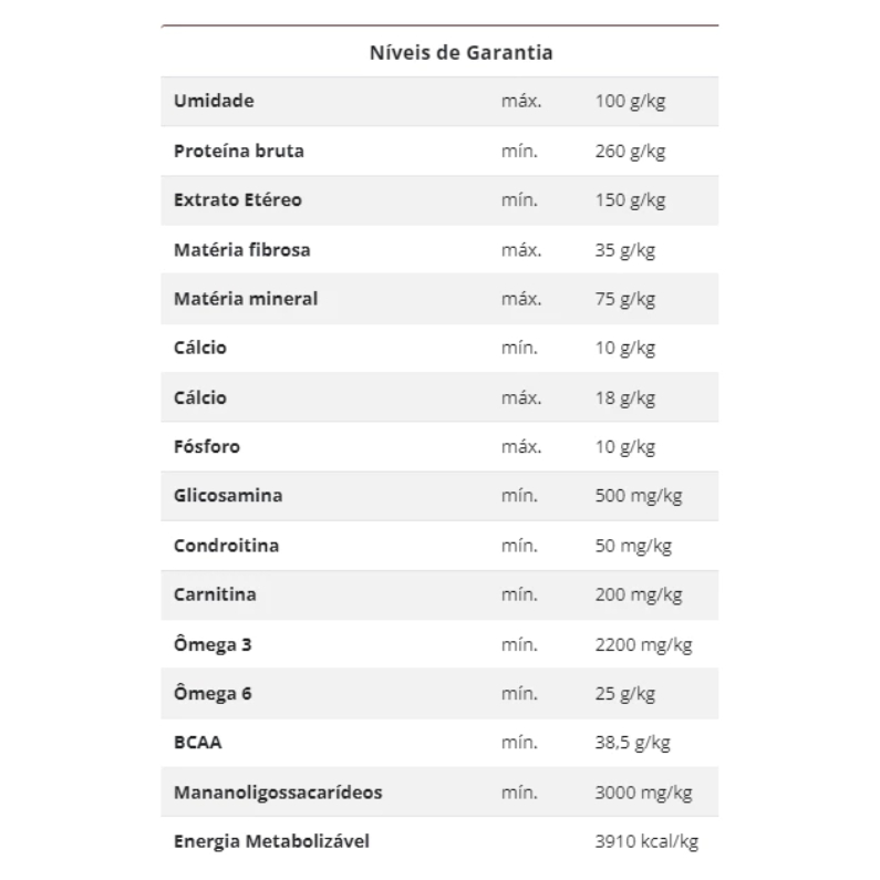 - 26% de Proteína - Contém Whey Protein - Contém BCAA - Ricos em Ômega 3 e 6 - DHA - Contém Condroitina e Glicosamina *Níveis de Garantia** - Umidade: máx.100 g/kg - Proteína bruta: mín.260 g/kg - Extrato Etéreo: mín.150 g/kg - Matéria fibrosa: máx.35 g/kg - Matéria mineral: máx.75 g/kg - Cálcio: mín.10 g/kg - Cálcio: máx.18 g/kg - Fósforo: máx.10 g/kg - Glicosamina: mín.500 mg/kg - Condroitina: mín.50 mg/kg - Carnitina: mín.200 mg/kg - Ômega 3: mín.2200 mg/kg - Ômega 6: mín.25 g/kg - BCAA: mín.38,5 g/kg - Mananoligossacarídeos: mín.3000 mg/kg - Energia Metabolizável. 3910 kcal/kg **Não utilizamos corantes artificiais na fabricação de nossos produtos. Portanto, podem ocorrer variações de tonalidade! Não afetando a qualidade do alimento ou suas características nutricionais.