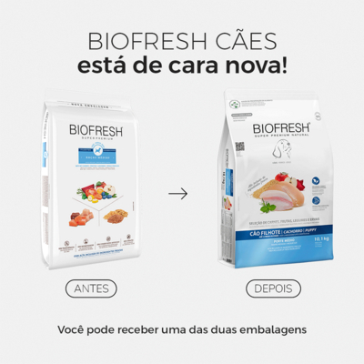 Biofresh®Cão Filhote Raças Médias - CONTRIBUI PARA A SAÚDE INTESTINAL EQUILIBRADA - CONTRIBUI PARA A SAÚDE ORAL - CONTRIBUI PARA O BRILHO DOS PELOS - CONTRIBUI PARA AS ARTICULAÇÕES SAUDÁVEIS Composição: Seleção de carnes frescas (filé de castanha, carne de frango e fígado de frango - fontes naturais de glicosamina) (mín. 15%), seleção de frutas, legumes e ervas frescas (maçãs, mamões, cenouras, beterrabas e orégano - fontes naturais de betacaroteno, vitaminas, minerais e fibras) (mín. 5%), blueberry (mirtilo) em pó, polpa de tomate concentrada (fonte natural de licopeno), ovo integral pasteurizado desidratado, farinha de torresmo, óleo de peixe refinado (fonte natural de EPA e DHA), sementes de linhaça, farinha de vísceras de frango e gordura de frango (preservados naturalmente com tocoferóis e extrato de alecrim), aveia, arroz integral, quirera de arroz, hidrolisado de fígado de frango e suíno, cloreto de sódio (sal comum), polpa de beterraba, prebióticos (parede celular de levedura (MOS – mín. 0,03%) e inulina (FOS – mín. 0,1%)), sulfato de glicosamina, sulfato de condroitina, L-carnitina, taurina, zeolita, hexametafosfato de sódio, DL-metionina, L-lisina, cloreto de potássio, cloreto de colina, vitaminas (A, B1, B2, B6, B12, C, D3, E, K3, H, niacina, ácido pantotênico e ácido fólico), minerais orgânicos (cobre aminoácido-quelato, ferro aminoácido-quelato, manganês aminoácido-quelato, zinco aminoácido-quelato, complexo selênio aminoácido), iodato de cálcio e antioxidantes naturais (concentrado de tocoferóis, extrato de alecrim, extrato de chá verde e ácido cítrico).