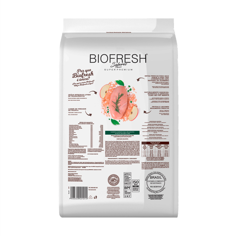 - Indicado para cães; - Ideal para cães adultos de raças mini e pequena; - Auxilia na saúde intestinal; - Pelagem brilhosa e pele sadia; - Sabor Frango, Maçã, Arroz integral e Ervas. A Ração Biofresh Sabores um alimento desenvolvido especialmente para cães adultos de raças pequenas e mini com paladar exigente, que conta com carne de frango de verdade. Com ingredientes frescos auxilia o seu cão para uma saúde oral prolongada, uma melhor longevidade, bom funcionamento do intestino e as articulações sempre fortes. Biofresh Frango atende paladares exigentes, contribui para a saúde intestinal equilibrada, mantém as articulações saudáveis e auxilia na saúde oral. Ingredientes Seleção de carnes frescas (carne e fígado de frango - fontes naturais de glicosamina) (mín. 15%), farinha de vísceras de frango e gordura de frango (preservados naturalmente com tocoferóis e extrato de alecrim), seleção de frutas, legumes e ervas frescas (maçãs (mín. 1%), mamões, beterrabas, cenouras e orégano (mín. 0,02%) - fontes naturais de betacaroteno, vitaminas, minerais e fibras) (mín. 5%), blueberry (mirtilo) em pó, polpa de tomate concentrada (fonte natural de licopeno), ovo integral pasteurizado desidratado, óleo de peixe refinado (fonte natural de EPA e DHA), sementes de linhaça, aveia, arroz integral (mín. 10%), quirera de arroz, hidrolisado de fígado de frango e suíno, levedura seca de cervejaria, cloreto de sódio (sal comum), polpa de beterraba, prebióticos (parede celular de levedura (MOS – mín. 0,03%)), extrato de yucca (mín. 0,02%), zeólita, hexametafosfato de sódio, DL-metionina, L-lisina, sulfato de glicosamina, sulfato de condroitina, cloreto de potássio, cloreto de colina, vitaminas (A, B1, B2, B6, B12, C, D3, E, K3, H, niacina, ácido pantotênico e ácido fólico), minerais orgânicos (cobre aminoácido-quelato, ferro aminoácido-quelato, manganês aminoácido-quelato, zinco aminoácido-quelato, complexo selênio aminoácido), iodato de cálcio e antioxidantes naturais (concentrado de tocoferóis, extrato de alecrim, extrato de chá verde e ácido cítrico).