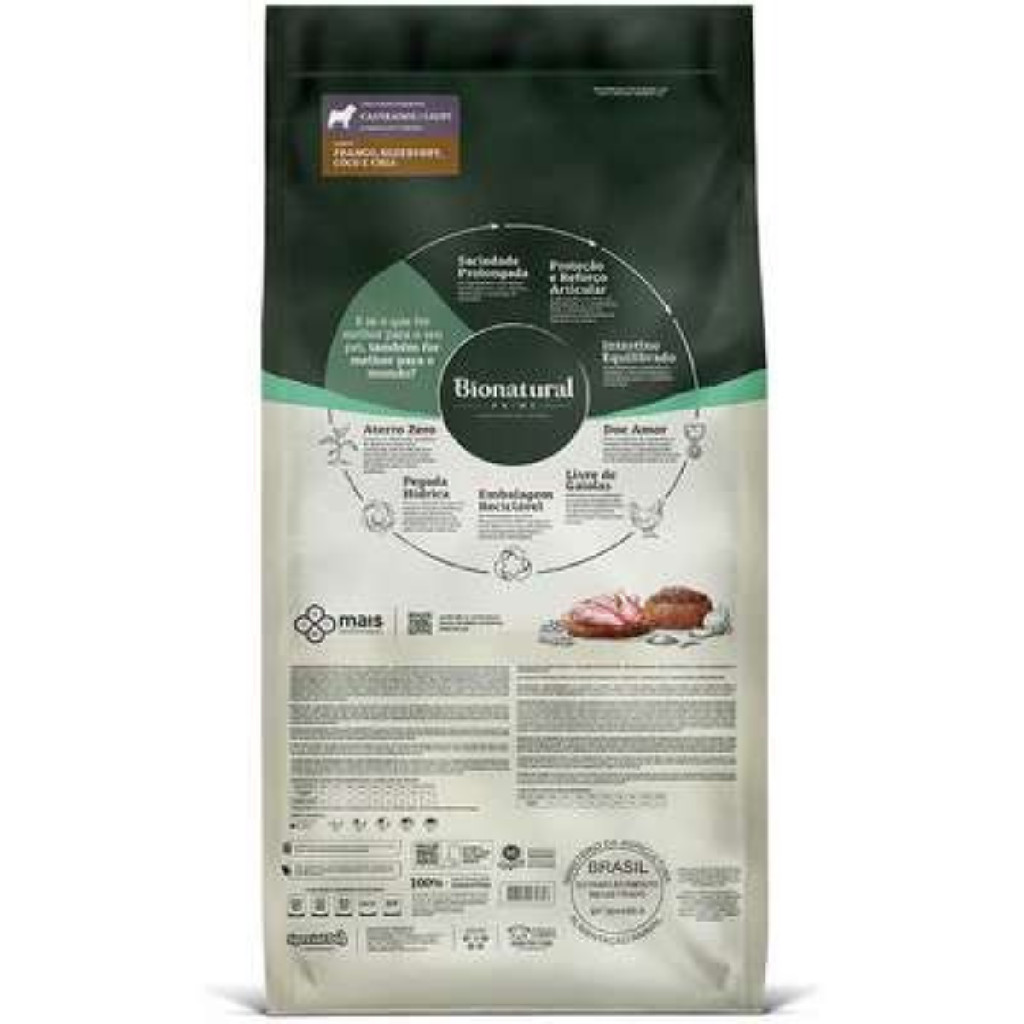 Ração Bionatural Prime 10,1Kg Light para Cães Castrados de Pequeno PorteA Ração Bionatural Prime 10,1Kg Light para Cães Castrados de Pequeno Porte é especialmente desenvolvida para atender às necessidades nutricionais de cães castrados, que possuem tendência ao ganho de peso devido às mudanças hormonais após a cirurgia. Com uma fórmula de baixa caloria e baixo teor de gordura, esta ração ajuda a manter o peso ideal do seu pet, sem comprometer a qualidade nutricional. Com frango como fonte principal de proteína, ela é ideal para cães de pequeno porte que necessitam de uma alimentação balanceada para um estilo de vida saudável e ativo. Composição e Ingredientes de Alta QualidadeFrango: Proteína de fácil digestão, rica em nutrientes essenciais para a manutenção da massa muscular e energia.Arroz: Fornece carboidratos de baixo índice glicêmico, oferecendo uma liberação controlada de energia e evitando o aumento de peso.Óleos vegetais: Contém ácidos graxos essenciais (ômega-3 e ômega-6), promovendo uma pelagem brilhante, além de manter a saúde da pele do seu cão.Fibras: Ajudam a regular o trânsito intestinal e promovem a saciedade, auxiliando no controle do peso do seu cão.Vitaminas e Minerais: A ração é enriquecida com vitaminas e minerais que fortalecem o sistema imunológico, ajudam na saúde óssea e favorecem o bom funcionamento geral do organismo.BenefíciosControle de peso: A fórmula light de baixo teor calórico e gorduroso é ideal para cães castrados, ajudando a manter o peso saudável sem causar ganho excessivo.Manutenção da musculatura: O frango, como principal fonte de proteína, contribui para a manutenção da massa muscular, importante para cães castrados que tendem a ganhar peso.Saúde digestiva: As fibras de alta qualidade ajudam na digestão e promovem a sensação de saciedade, evitando o apetite excessivo.Saúde da pele e pelagem: A presença de ácidos graxos essenciais (ômega-3 e ômega-6) contribui para uma pelagem saudável e brilhante, além de manter a pele do seu pet em boa condição.Fortalecimento imunológico: As vitaminas e minerais presentes na ração ajudam a manter o sistema imunológico do cão forte, promovendo a saúde geral.IndicaçãoA Ração Bionatural Prime 10,1Kg Light é indicada para cães castrados de pequeno porte (até 10 kg), com idade superior a 12 meses. Após a castração, os cães têm tendência a ganhar peso devido às alterações hormonais, e essa fórmula light ajuda a controlar o peso, ao mesmo tempo que oferece todos os nutrientes essenciais para o bem-estar do seu pet. CaracterísticasIdade: Adulto (acima de 12 meses)Tamanho do cão: Pequeno porte (até 10 kg)Formulação: Frango como proteína principal e fórmula lightTamanho do pacote: 10,1 kg (ideal para quem busca praticidade e um pacote de maior duração)Livre de corantes e conservantes artificiaisConclusãoA Ração Bionatural Prime 10,1Kg Light para Cães Castrados de Pequeno Porte é a escolha ideal para manter seu cão castrado saudável, com o peso controlado e uma alimentação equilibrada. Sua fórmula nutritiva e leve proporciona os nutrientes essenciais para o desenvolvimento muscular, a saúde digestiva, além de garantir uma pelagem bonita e saudável. Ofereça ao seu pet uma alimentação que respeita suas necessidades específicas com Bionatural Prime.