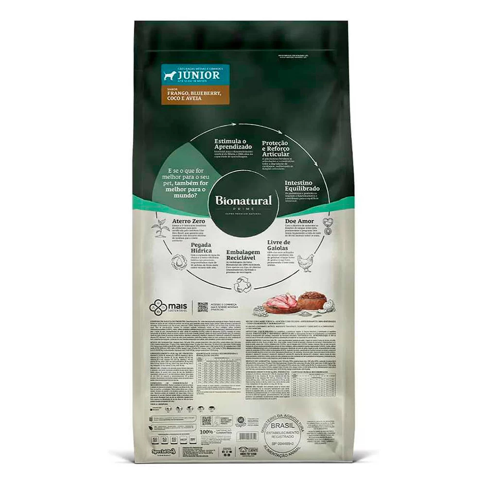Ração Bionatural Prime Cães Junior Raças Médias e Grandes Frango 15Kg - Feito com carnes frescas; - Zero adição de transgênicos, corantes e aromatizantes; - Redução de tártaro; - Proteção e reforço articular; - Intestino equilibrado; Bionatural Frango para Cães Junior de Raças Médias e Grandes é formulada com carnes frescas, frutas e cereais, além de não possuir adição de conservantes, corantes e aromatizantes. Contém glicosamina e condroitina que auxiliam na proteção articular, além da combinação entre prebióticos e probióticos que contribuem para a saúde intestinal e, hexametafosfato de sódio para redução do tártaro. Composição básica Carne fresca (mín. 3% - carne mecanicamente separada de frango e fígado de suínos), farinha de vísceras de aves, farinha de torresmo, ovo em pó, arroz quebrado, sorgo integral moído, ômega 3 [óleo de peixes e biomassa de microalgas (Schizochytrium sp.)], óleo de aves, aveia (mín. 3,95%), blueberry (mirtilo mín. 0,015%), coco em flocos (mín. 0,015%), banana, maçã, fibra de cana-de-açúcar, levedura de cervejaria inativada desidratada, extrato de Yucca schidigera, aditivo prebiótico (mananoligossacarídeos 0,006%), zeólita, aditivos probióticos (Bifidobacterium lactis e Lacticaseibacillus rhamnosus), hidrolisado de carne de aves e fígado de aves, hexametafosfato de sódio, sulfato de condroitina (0,03%), sulfato de glicosamina (0,05%), regulador de acidez, concentrado de tocoferol, extrato de alecrim, extrato de chá verde (Camellia sinenses), extrato de menta, hortelã (Mentha spp.), DL-metionina, L-lisina, L-triptofano, cloreto de sódio, cloreto de potássio, vitamina A, vitamina D3, vitamina E, vitamina K3, vitamina B1, vitamina B2, vitamina B6, vitamina B12, vitamina C, niacina, cloreto de colina, ácido pantotênico, ácido fólico, biotina, iodato de cálcio, proteinato de cobre, proteinato de ferro, proteinato de manganês, proteinato de zinco, levedura enriquecida com selênio, ácido propiônico, parede celular de levedura. Níveis de Garantia: Umidade (máx.) 100 g/kg (10%), proteína bruta (mín.) 250 g/kg (25%), extrato etéreo (mín.) 140 g/kg (14%), matéria mineral (máx.) 75 g/kg (7,5%), matéria fibrosa (máx.) 30 g/kg (3%), cálcio (máx.) 16 g/kg (1,6%), cálcio (mín.) 8.000 mg/kg (0,8%), fósforo (mín.) 6.000 mg/kg (0,6%), sódio (mín.) 1.200 mg/kg (0,12%), potássio (mín.) 5.800 mg/kg (0,58%), DL- metionina (mín.) 6.500 mg/kg (0,65%), L-lisina (mín.) 12 g/kg (1,2%), L-triptofano (mín.) 1.500 mg/kg (0,15%), DHA (mín.) 700 mg/kg (0,07%), ômega 6 (mín.) 30g/kg (3%), ômega 3 (mín.) 3.200 mg/kg (0,32%), Bifidobacterium lactis (mín.) 1x108 UFC/kg, Lacticaseibacillus rhamnosus (mín.) 1x108 UFC/kg, energia metabolizável 3.855 kcal/kg.