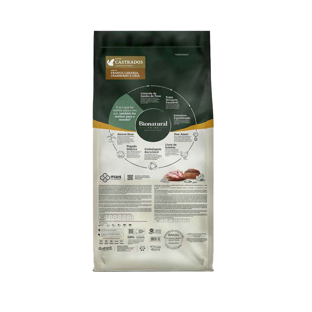 Ração Bionatural Prime Gatos Castrados SABOR FRANGO, LARANJA, CRANBERRY E CHIA 20 KG Nossos especialistas extraíram o melhor da natureza para desenvolver uma linha altamente nutritiva e balanceada. Bionatural é um alimento Super Premium Natural formulado com carnes frescas, antioxidantes naturais e sem adição de transgênicos, corantes e aromatizantes. Combinado com frutas e cereais, proporciona uma experiência única de alta palatabilidade e aproveitamento dos nutrientes. Alinhadas a princípios sustentáveis, as embalagens 100% recicláveis fazem parte das práticas responsáveis da Bionatural, com o objetivo de proporcionar vida longa e saudável para os pets e para o planeta. Através do Programa Mais Sustentável, assumimos o compromisso de fazer mais pelo Meio Ambiente, Animais, Indivíduos e Sociedade. Feito com ingredientes da nossa terra. Bionatural é nutrição que vem da natureza! - CONTROLE DO GANHO DE PESO BAIXO TEOR CALÓRICO + L- CARNITINA - TRATO URINÁRIO SAUDÁVEL CONTROLE DO PH DA URINA - INTESTINO EQUILIBRADO PREBIÓTICOS E PROBIÓTICOS