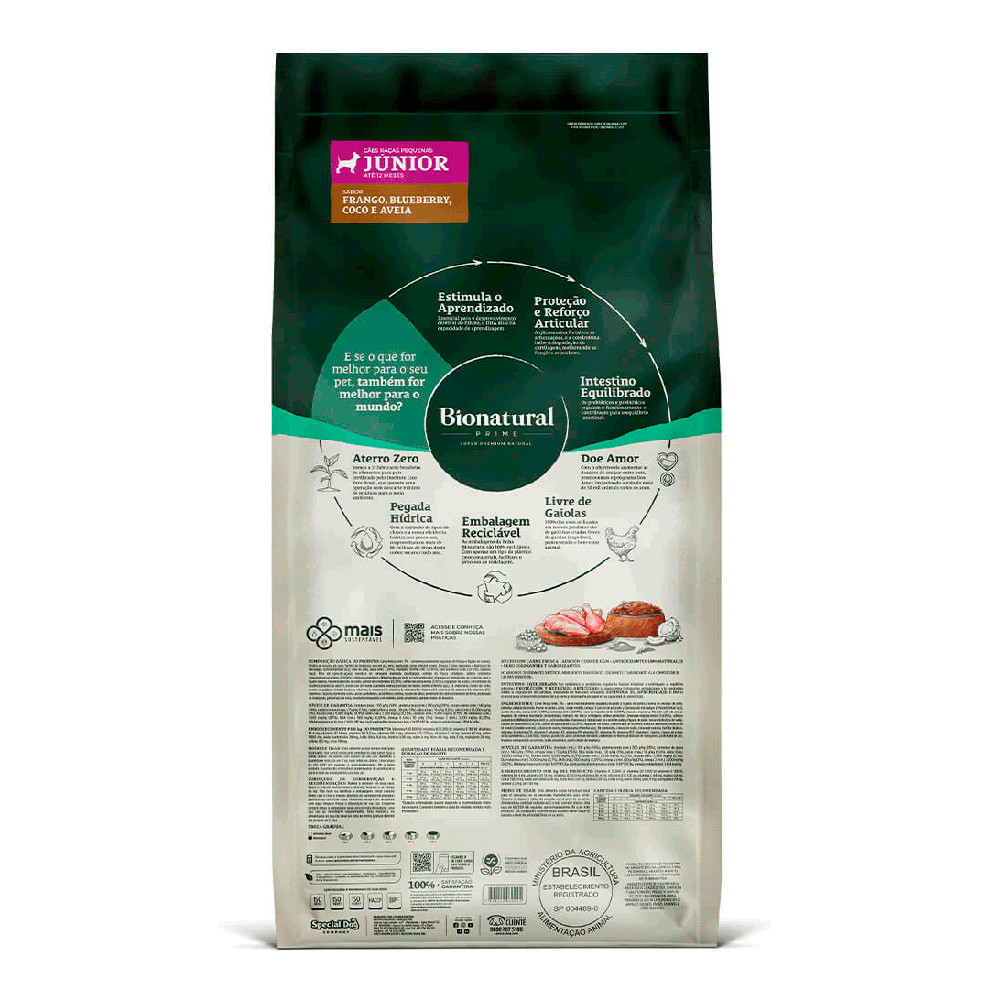 - Indicado para cães; - Ideal para cães filhotes de porte pequeno; - Estimula o aprendizado, formulado com DHA; - Proteção articular com condroitina + glicosamina; - Auxilia na saúde intestinal; - Sabor irresistível de frango, blueberry, coco e aveia. A Ração Bionatural Prime Frango Cães Filhotes é um alimento Super Premium completo e balanceado para o seu cãozinho. Elaborado por veterinários, oferece uma nutrição completa para filhotes raças pequenas até 12 meses, ajudando no desenvolvimento saudável, contém DHA, um nutriente essencial para o desenvolvimento cerebral, estimula o aprendizado e auxilia no crescimento cognitivo dos filhotes. Ração Bionatural Filhotes possui condroitina e glucosamina, que são essenciais para o reforço e proteção articular, promovem uma articulação saudável e maior mobilidade para raças pequenas. Enriquecida com prebióticos e probióticos, que ajudam a manter a flora intestinal saudável. Ingredientes Carne fresca (mín. 3% - carne mecanicamente separada de frango e fígado de suínos), farinha de vísceras de aves, farinha de torresmo, ovo em pó, arroz quebrado, sorgo integral moído, ômega 3 [óleo de peixes e biomassa de microalgas (Schizochytrium sp.)], óleo de aves, aveia (mín. 3,95%), blueberry (mirtilo mín. 0,015%), coco em flocos (mín. 0,015%), banana, maçã, fibra de cana-de-açúcar, levedura de cervejaria inativada desidratada, extrato de Yucca schidigera, aditivo prebiótico (mananoligossacarídeos 0,006%), aditivos probióticos (Bifidobacterium lactis e Lacticaseibacillus rhamnosus), hidrolisado de carne de aves e fígado de aves, hexametafosfato de sódio, sulfato de condroitina (0,03%), sulfato de glicosamina (0,05%), regulador de acidez, concentrado de tocoferol, extrato de alecrim, extrato de chá verde (Camellia sinensis), extrato de menta, hortelã (Mentha spp.), DL-metionina, cloreto de sódio, cloreto de potássio, fosfato bicálcico, vitamina A, vitamina D3, vitamina E, vitamina K3, vitamina B1, vitamina B2, vitamina B6, vitamina B12, vitamina C, niacina, cloreto de colina, ácido pantotênico, ácido fólico, biotina, iodato de cálcio, proteinato de cobre, proteinato de ferro, proteinato de manganês, proteinato de zinco, levedura enriquecida com selênio, ácido propiônico, parede celular de levedura.