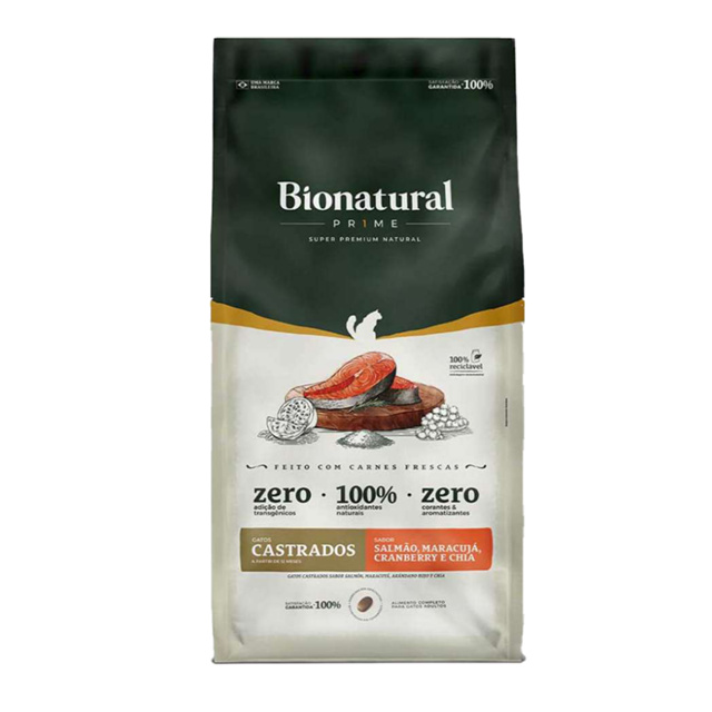 Ração Bionatural Prime para Gatos Castrados sabor Salmão 20 KG Alinhadas a princípios sustentáveis, as embalagens 100% recicláveis fazem parte das práticas responsáveis da Bionatural, com o objetivo de proporcionar vida longa e saudável para os pets e para o planeta. Através do Programa Mais Sustentável, assumimos o compromisso de fazer mais pelo Meio Ambiente, Animais, Indivíduos e Sociedade. Feito com ingredientes da nossa terra. Bionatural é nutrição que vem da natureza! - CONTROLE DO GANHO DE PESO BAIXO TEOR CALÓRICO + L- CARNITINA - TRATO URINÁRIO SAUDÁVEL CONTROLE DO PH DA URINA - INTESTINO EQUILIBRADO PREBIÓTICOS E PROBIÓTICOS Composição Básica: Farinha de salmão, carne fresca (mín. 3% - carne mecanicamente separada de frango e fígado de suínos), farinha de vísceras de aves, farinha de torresmo, ovo em pó, plasma sanguíneo desidratado de suíno, arroz quebrado, sorgo integral moído, ômega 3 [óleo de peixes e biomassa de microalgas (Schizochytrium sp.)], óleo de aves, grão de cevada, sementes de chia (mín. 0,10%), maracujá (min. 0,015%), cranberry (mín. 0,015%) , laranja, fibra de mandioca, levedura de cervejaria inativada desidratada, extrato de Yucca schidigera, aditivo prebiótico (mananoligossacarídeos 0,006%), aditivos probióticos (Bifidobacterium lactis e Lacticaseibacillus rhamnosus), hidrolisado de fígado de suínos , hexametafosfato de sódio, regulador de acidez, concentrado de tocoferol, extrato de alecrim, extrato de chá verde (Camellia sinenses), extrato de menta, hortelã (Mentha spp.), L-carnitina, DL-metionina, taurina, cloreto de sódio, cloreto de potássio, vitamina A, vitamina D3, vitamina E, vitamina K3, vitamina B1, vitamina B2, vitamina B6, vitamina B12, vitamina C, niacina, cloreto de colina, ácido pantotênico, ácido fólico, biotina, iodato de cálcio, proteinato de cobre, proteinato de ferro, proteinato de manganês, proteinato de zinco, levedura enriquecida com selênio, ácido propiônico, parede celular de levedura.