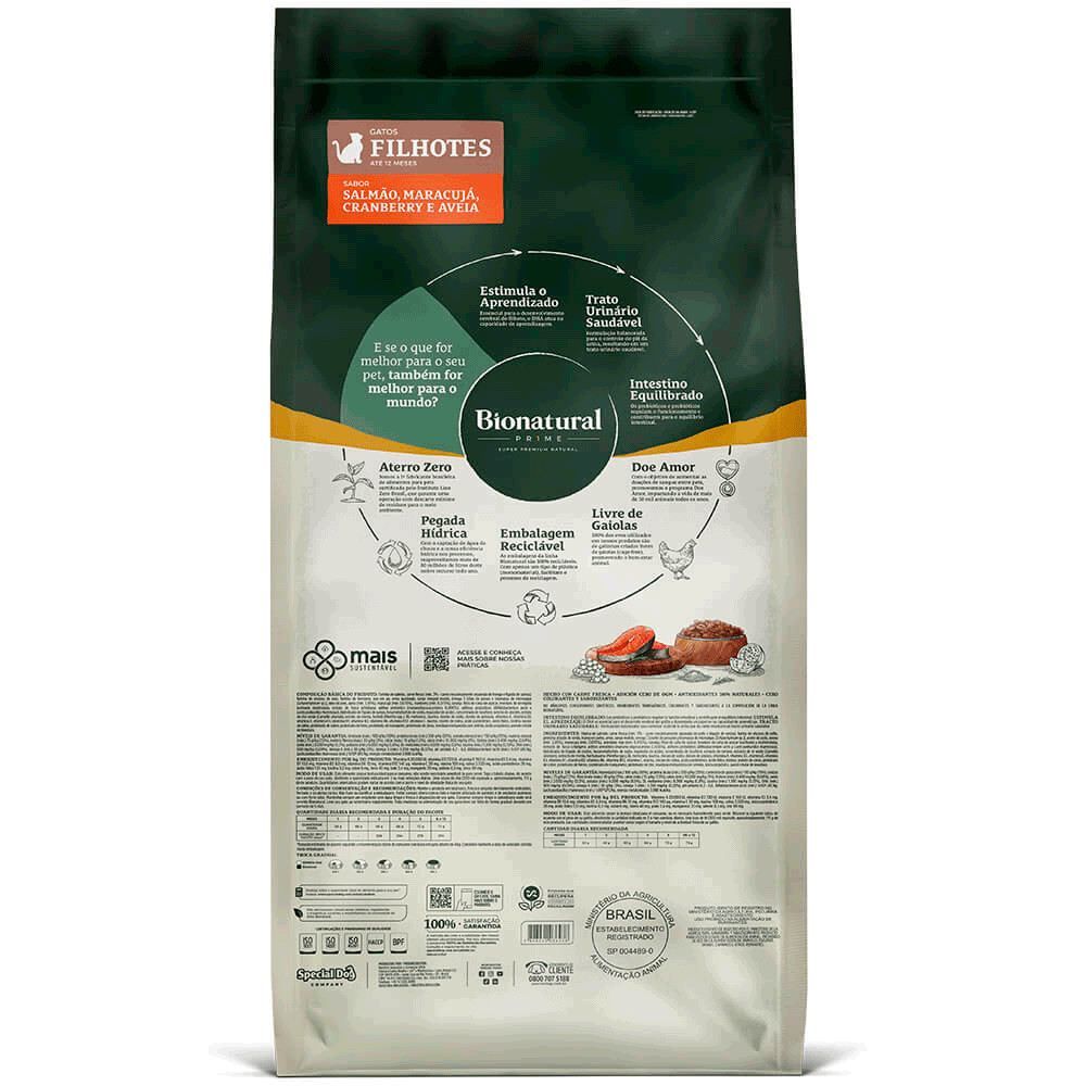 A Ração Bionatural Prime Salmão Gatos Filhotes é um alimento Super Premium completo e balanceado, indicado para gatos filhotes em fase de crescimento até 12 meses. Elaborado por veterinários, possui proteínas de alta qualidade e farinha de algas, fonte nobre de DHA. Enriquecida com DHA, um nutriente essencial para o crescimento cognitivo, ajuda a fortalecer o sistema nervoso e a capacidade de aprendizado. Bionatural cuida do trato urinário, controlando o pH da urina e ajudando a prevenir a formação de cálculos urinários, que são comuns em gatos. Ingredientes Farinha de salmão, carne fresca (mín. 3% - carne mecanicamente separada de frango e fígado de suínos), farinha de vísceras de aves, farinha de torresmo, ovo em pó, arroz quebrado, sorgo integral moído, ômega 3 [óleo de peixes e biomassa de microalgas (Schizochytrium sp.)], óleo de aves, aveia (mín. 3,95%), maracujá (mín. 0,015%), cranberry (mín. 0,015%), laranja, fibra de cana-de-açúcar, levedura de cervejaria inativada desidratada, extrato de Yucca schidigera, aditivo prebiótico (mananoligossacarídeos 0,006%), aditivos probióticos (Bifidobacterium lactis e Lacticaseibacillus rhamnosus), hidrolisado de fígado de suínos, hexametafosfato de sódio, regulador de acidez, concentrado de tocoferol, extrato de alecrim, extrato de chá verde (Camellia sinensis), extrato de menta, hortelã (Mentha spp.), DL-metionina, taurina, cloreto de sódio, cloreto de potássio, vitamina A, vitamina D3, vitamina E, vitamina K3, vitamina B1, vitamina B2, vitamina B6, vitamina B12, vitamina C, niacina, cloreto de colina, ácido pantotênico, ácido fólico, biotina, iodato de cálcio, proteinato de cobre, proteinato de ferro, proteinato de manganês, proteinato de zinco, levedura enriquecida com selênio, ácido propiônico, parede celular de levedura.
